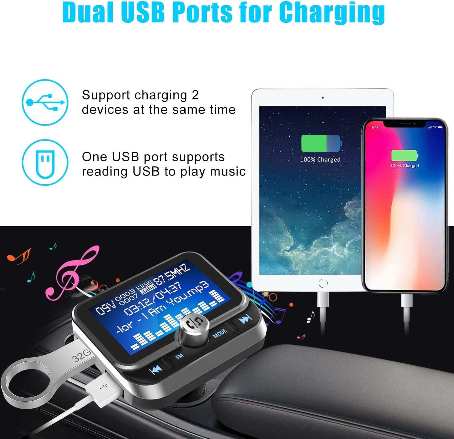 [ Dual USB Ports & Fast Charging ]: The Bluetooth car transmitter with 2 USB charging ports, which one is able to plug the U disk for music, also you can get your devices full charged in short time, wireless Audio Cell Phone hands free car transmitter support charging 2 devices at a time, which is 3.4A together(5V/ 2.4A, 5V/ 1A), the FM transmitter with built-in smart chip( charging IC) will divide the voltage based on the need of device automatically