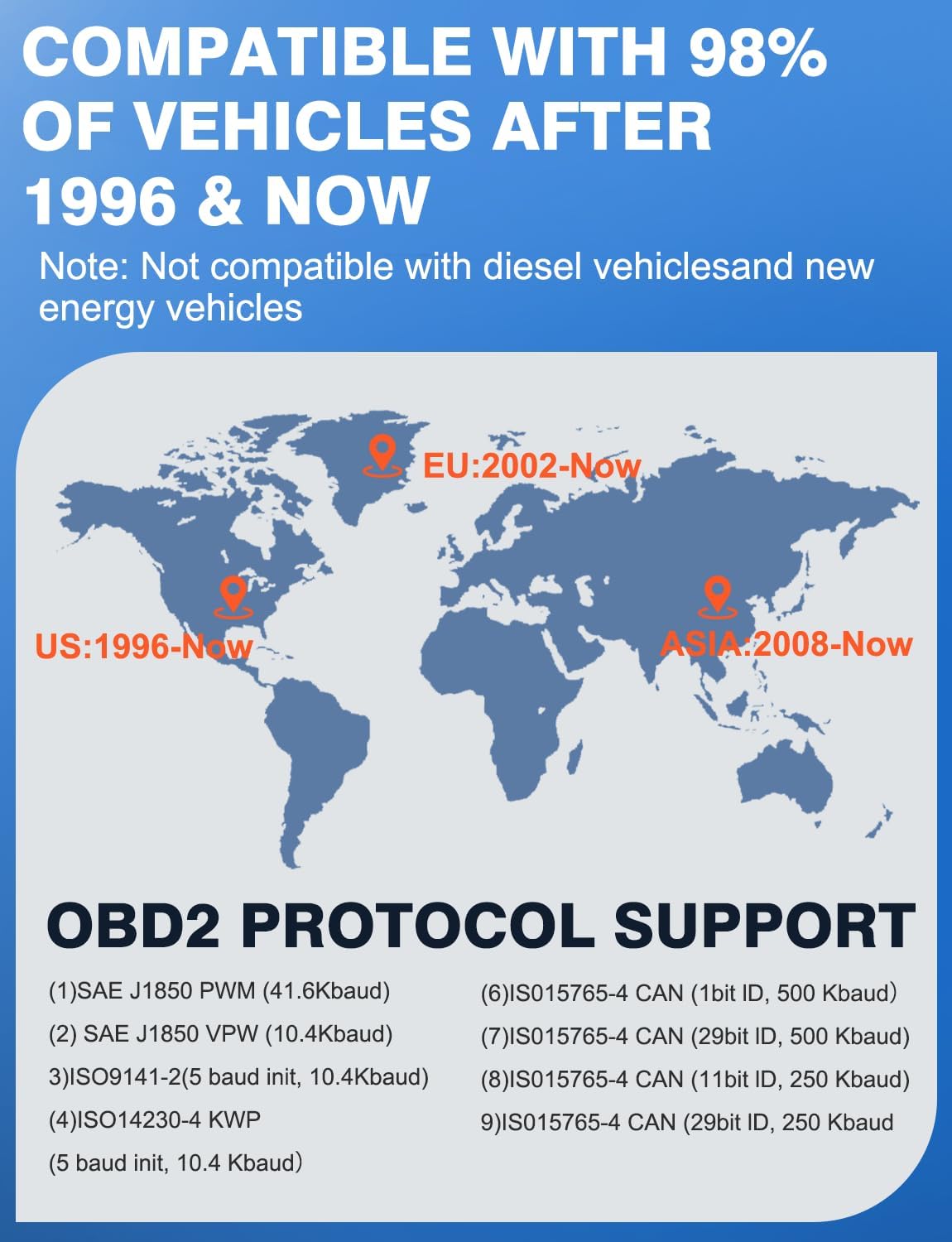 【Automotive Compatibility】 Our scanner for car support vehicles that comply with OBD2 standards in the United States, Asia, and Europe. 12V light diesel vehicles with a load of 6.5T or less, covering vehicles from 1996 to present and 9 OBD2 protocols. This ensures that almost any car owner can benefit from its wide range of features. The device also supports multiple languages, including English, German, Spanish, Finnish, French, Italian, Dutch, Portuguese, and Chinese.