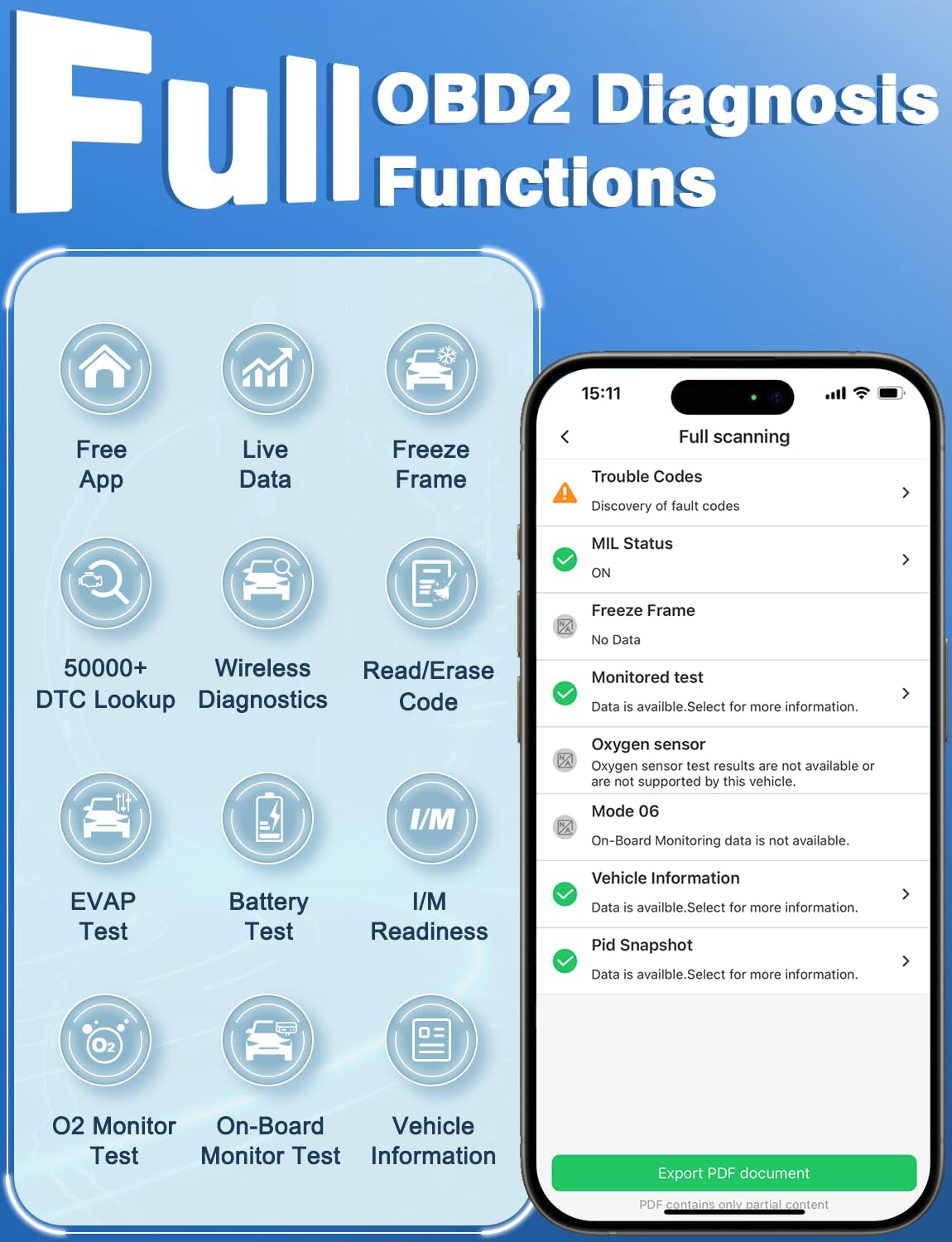 【Full OBD2 Functions】The car code reader provides a complete diagnostic solution, allowing you to have a comprehensive understanding of the vehicle’s condition. It supports various performance tests, including speed performance analysis, engine displacement calculation, and car fuel consumption analysis, battery health check, freeze frame data, sensor testing, in vehicle monitoring, and evaporative system testing.