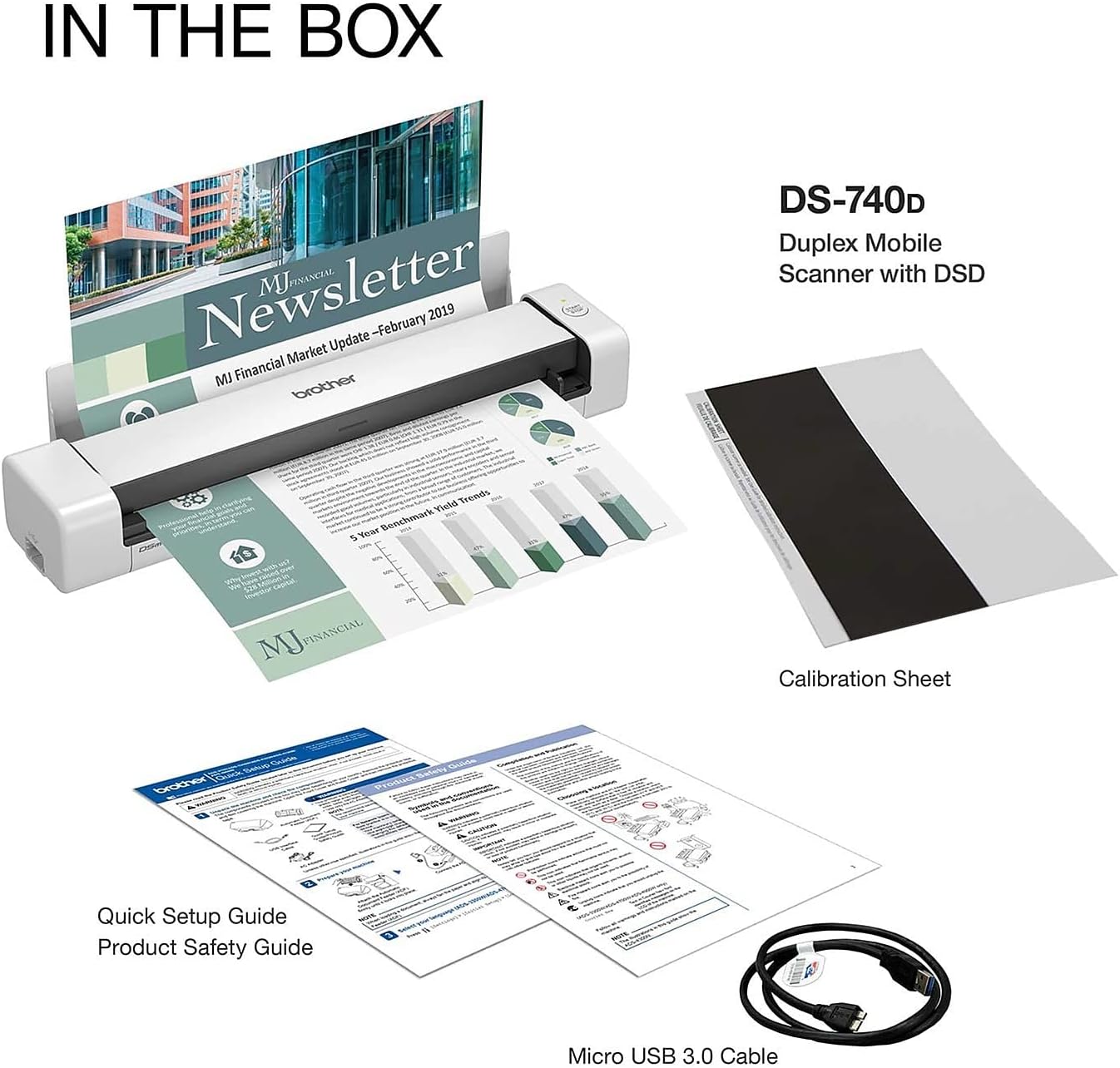 With its compact mobile design and simple workflow applications the Brother DS-740D duplex mobile document scanner is ideal for on-the-go small office/home office professionals It quickly scans single and double-sided materials up to 16ppm(1) in a single pass through a local USB connection Power the DS-740D through a micro USB 3 0 cable connection to your laptop or PC and experience the portability that makes this product the perfect work partner for mobile professionals Scan to multiple destinations including File Image OCR Email and cloud services(4) with the Brother free iPrint&Scan for desktop software Compatible with Windows Mac and Linux Supports TWAIN/WIA for PC/ICA for Mac/SANE drivers (3) Scan two-sided documents once eliminating the need to rescan the same document saving time and avoiding deterioration of your originals Save space with the new DSD (Desk Saving Design) feature from Brother which drastically reduces desk space needed to operate the device Enhance scans with automatic color detection/adjustment image rotation (PC only) bleed through prevention/background removal text enhancement and color drop (4) The DS-740D small footprint and light weight make it ideal for users that need to scan on-the-go The included software suite provides document management and OCR software for easy storage and retrieval of your documents Have confidence with a one-year limited and free lifetime product online call or live chat support (5) Disclaimers (1)Color and monochrome scan speed letter size paper at 300dpi (2)Based on Letter (8 5 x 11 inch) size paper (3)Drivers and bundled software available via download at solutions brother Internet connection required Refer to User Guide for more information (4)When connected to a PC with applicable software Drivers and bundled software available via download at solutions brother Internet connection required Refer to User Guide for more information (5)Free technical support only in USA.
