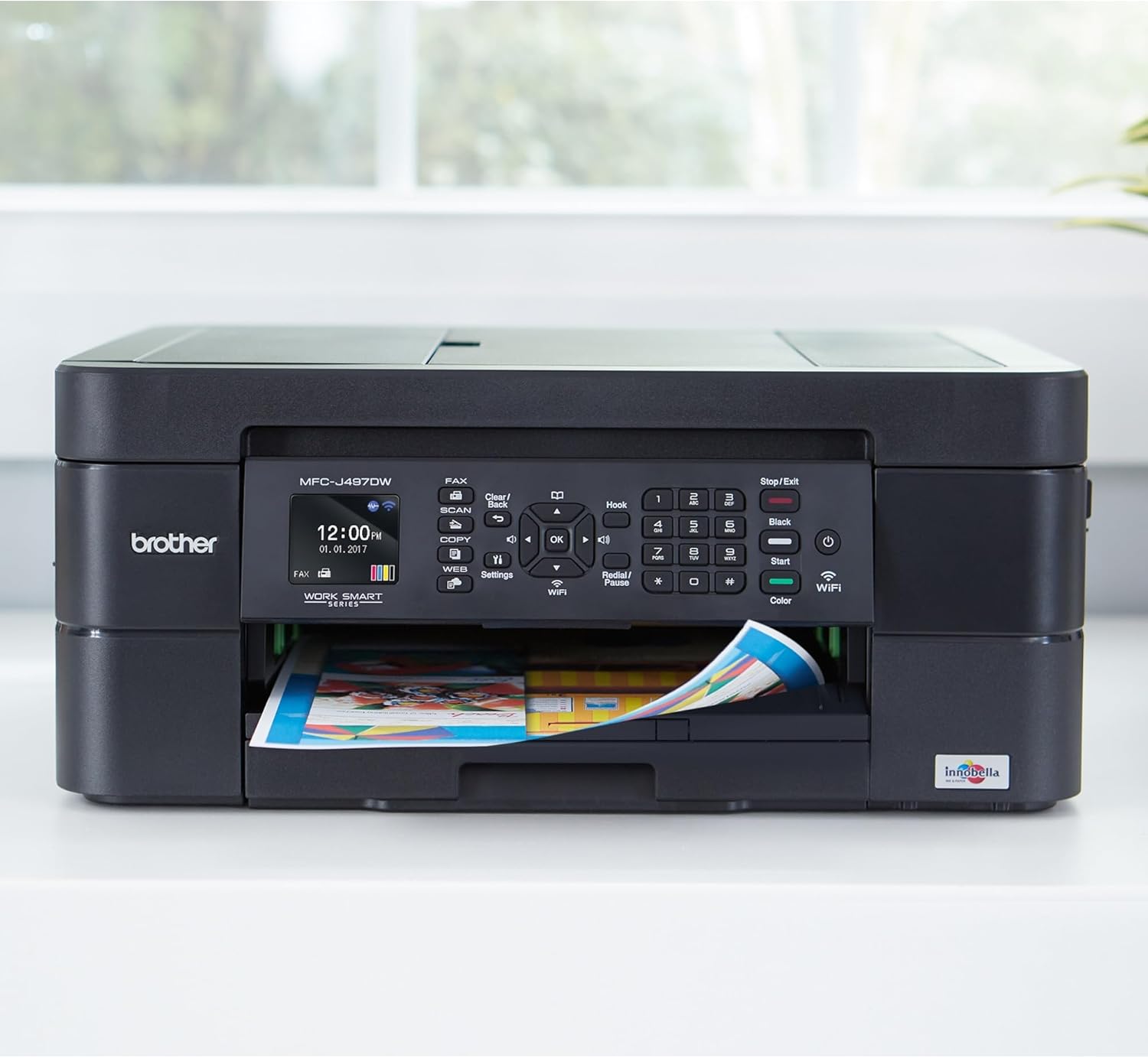 The Brother work Smart Series MFC-J497DW is easy to connect, compact, affordable and loaded with features and functionality to help boost productivity in your home, Home office, dorm room or small office. This wireless color inkjet all-in-one delivers high-quality output, lets you reliably Print, copy, scan and fax and enables wireless mobile device printing from your desktop, Laptop, smartphone or tablet (requires connection to a wireless network). use the automatic document feeder and 100-sheet capacity paper tray for generous output without constant monitoring and help save paper with automatic duplex (2-sided) printing. Cloud connectivity lets you scan-to popular cloud services directly from the printer (requires an Internet connection and an account with desired service). Comes with a one-year limited warranty and free online, call, or live chat support for the life of the printer.