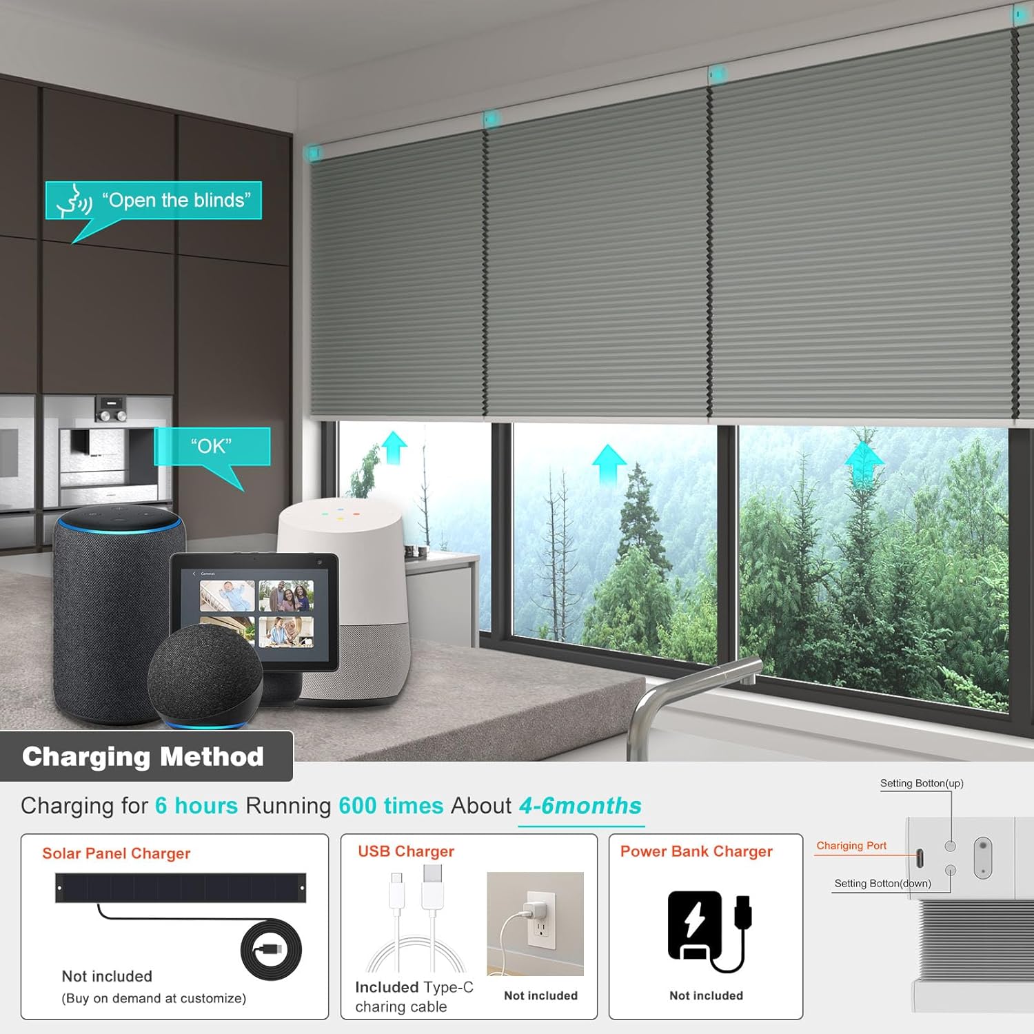 MOTORIZED CELLULAR SHADES: Electric blackout blinds with a high-quality rechargeable motor, can be used for 6 months once fully charged. Remote control shades up and down at the tip of your finger