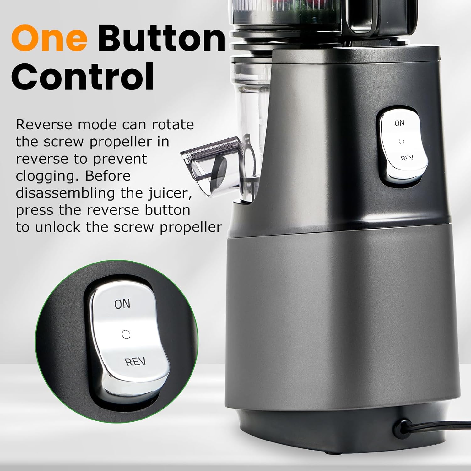 【ONE BUTTON CONTROL】One-button design makes your juicing process as simple as possible. There is a reverse mode, if the blockage occurs in the juicing process, just filpping the button can make the juicer rotate in the opposite direction, clear the blockage, and ensure that the juicing is uninterrupted. In the juicing process, if the lid is accidentally opened, the masticating juicer will automatically stop working, and the juicer will not start if the lid is not covered, to ensure the safety of the user