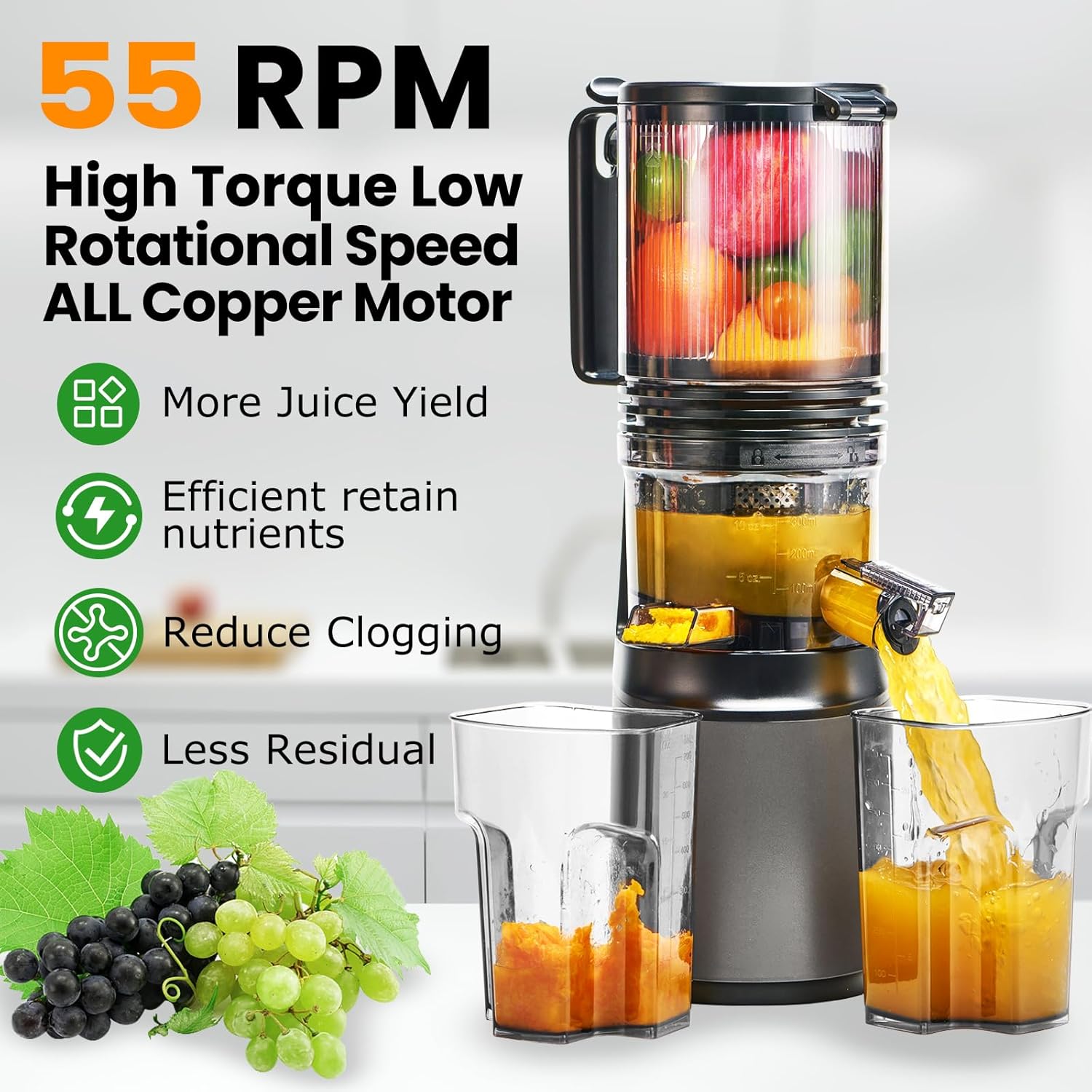 【HIGH TORQUE】250W all-copper high power motor provides superpower for the screw propeller with a speed of 55 RPM, and the low-speed masticating technology enables most fruits and vegetables to be fully squeezed, making the pulp-juice separation process more thorough. Extract every drop of juice