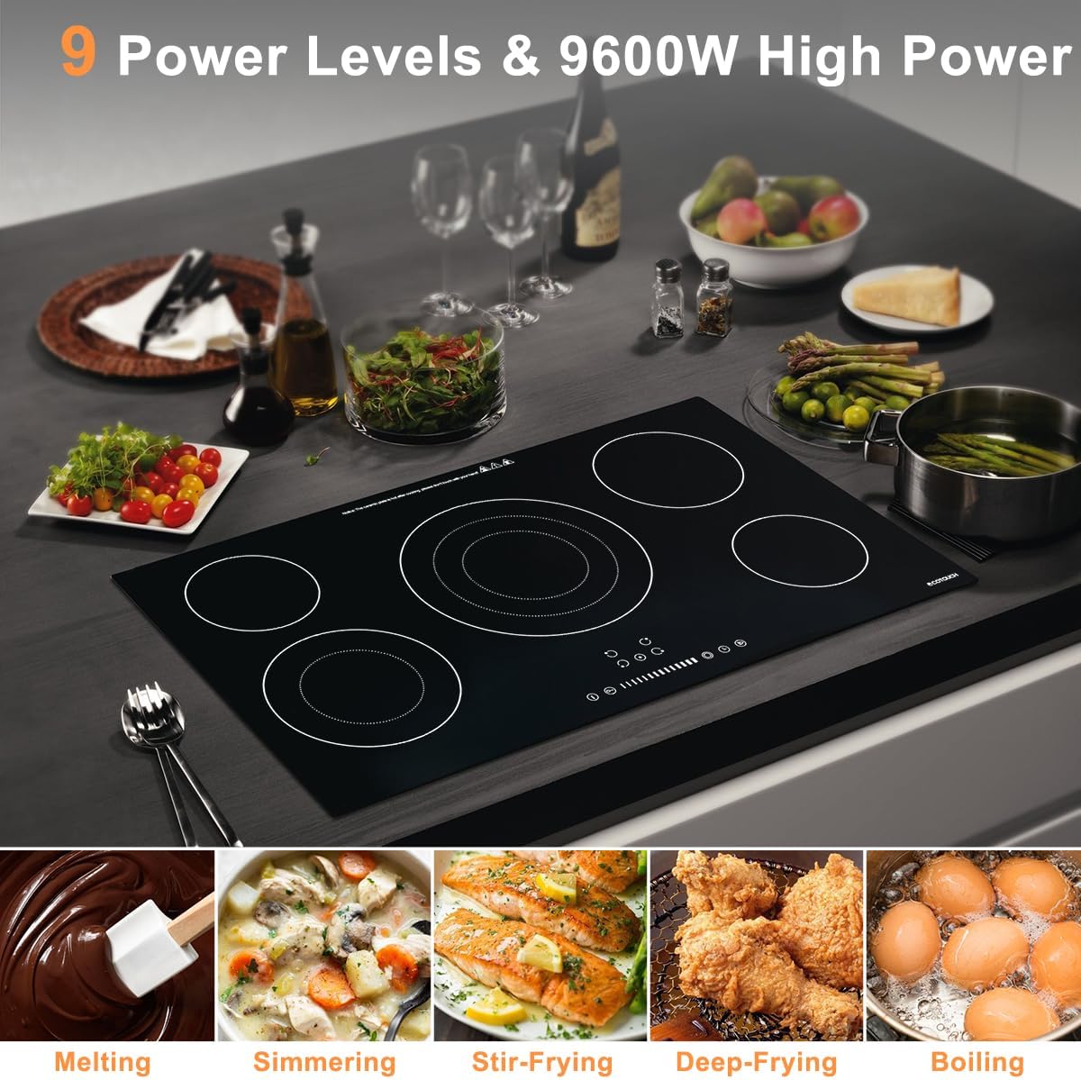 【Meet A Variety of Cooking Needs】Even though the electric cooktop 5 burners is as powerful as 9600W, it promises delicate and stable gentle warming up when you do chocolate melting and simmering, this is delivered by its outstanding heating control protocol and combination of residual heat of the glass panel. All cooking needs could be easily met and achieved via the simple and user-friendly control panel, just choose a burner and slide control to get power level you need, this stove top will do excellent delivery.
