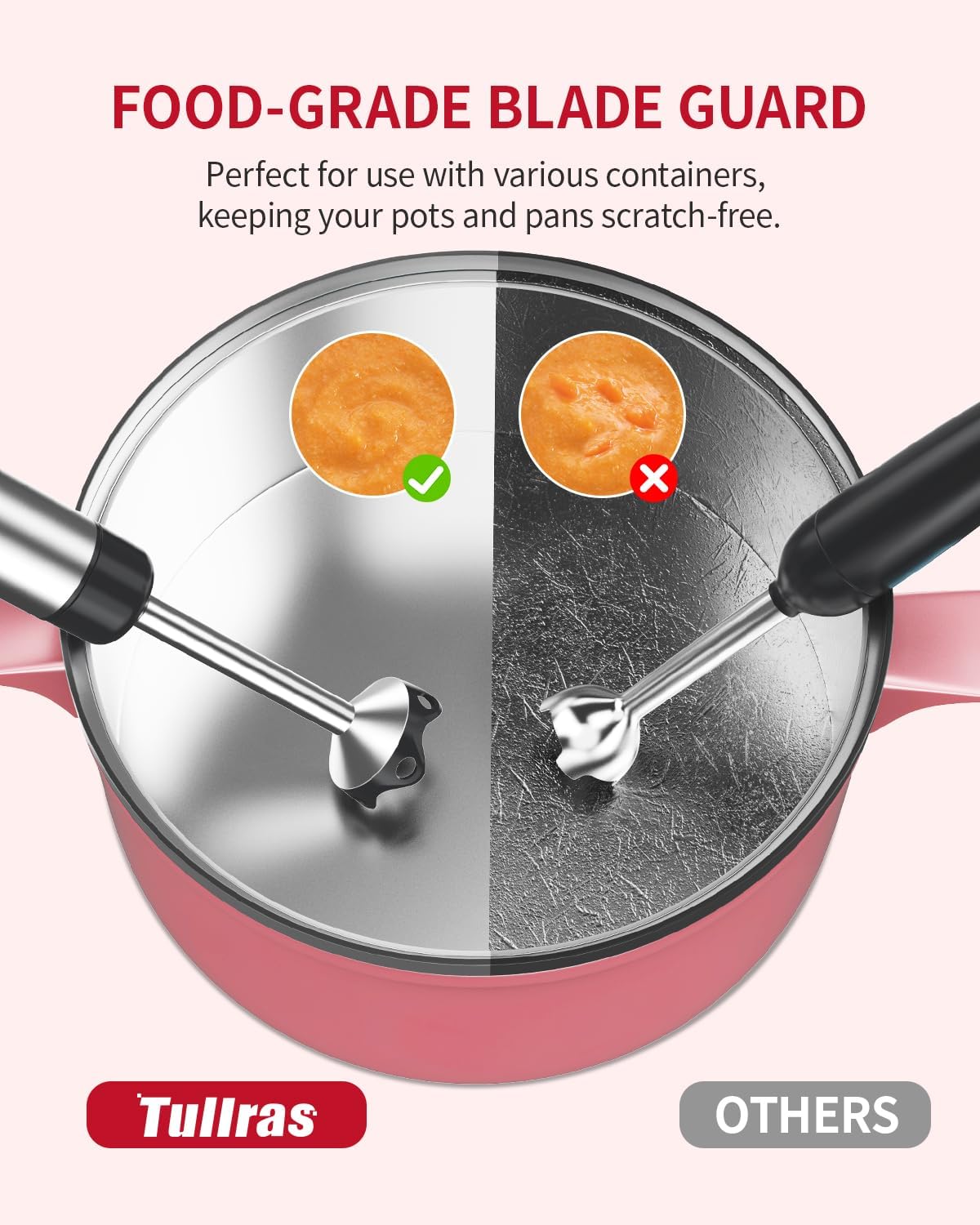 SCRATCH-RESISTANT & SPLASH-PROOF – This emulsion blender handheld features a food-grade blade protector that is scratch-resistant and splash-proof, enhancing safety and making cleanup easy. The protector effectively prevents the blades from scratching your cookware, extending its lifespan. The splash-proof design ensures that ingredients stay contained while blending, reducing the mess in your kitchen. You can focus on cooking and enjoy every moment without worrying about accidental spills.