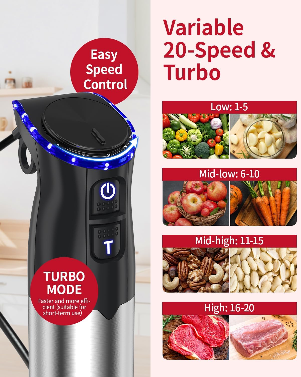 20-SPEED & TURBO BOOST – With 20 adjustable speeds, you can easily select the perfect setting for different ingredients and cooking needs. Whether you’re gently mixing eggs, whipping cream quickly, or powerfully blending tough ingredients, you’ll find the ideal speed for perfect results. The turbo boost mode provides extra power when handling thick or sticky ingredients, helping you complete your blending tasks quickly and efficiently.
