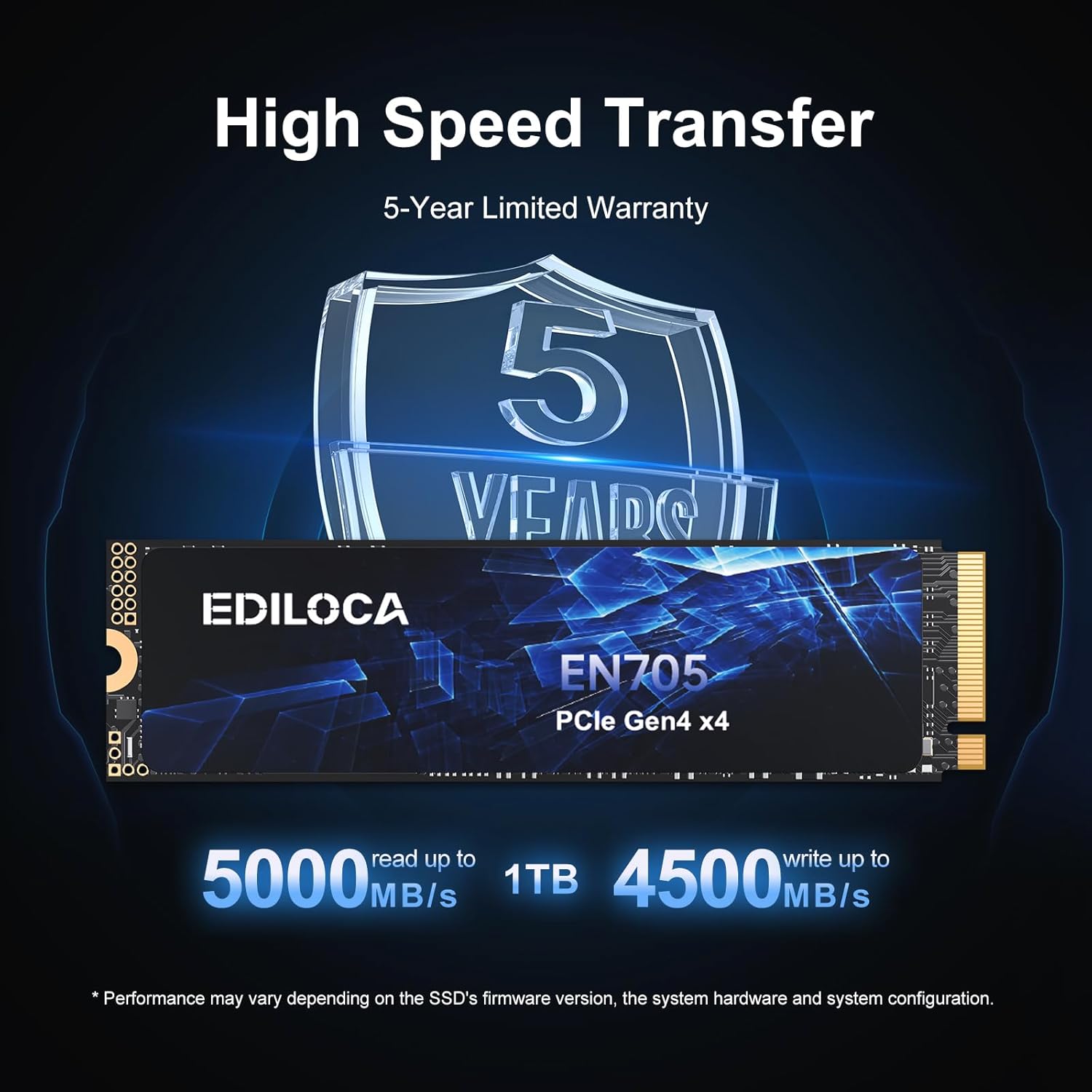 【High Speed Transfer】 Interface: NVMe1.4/PCIe Gen4 x4.The sequential read/write speed of EN705 PCIe 4.0 SSD 1TB is up to 5000/4500 MB/s.This NVMe SSD is designed for hardcore gamers, professionals, and creatives who demand high-performance computing.