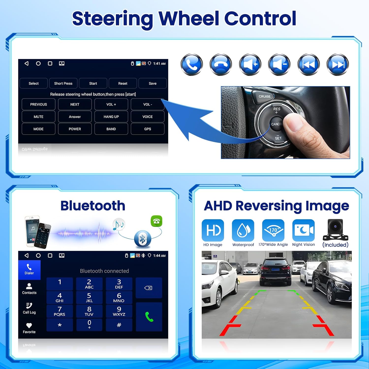 AHD Backup Camera and SWC: Android touch screen equipped with high-definition camera and support reverse camera input to ensure safe driving and parking. After completing the original steering wheel control buttons learning, you can easily control the touch screen without additional purchase of other accessories