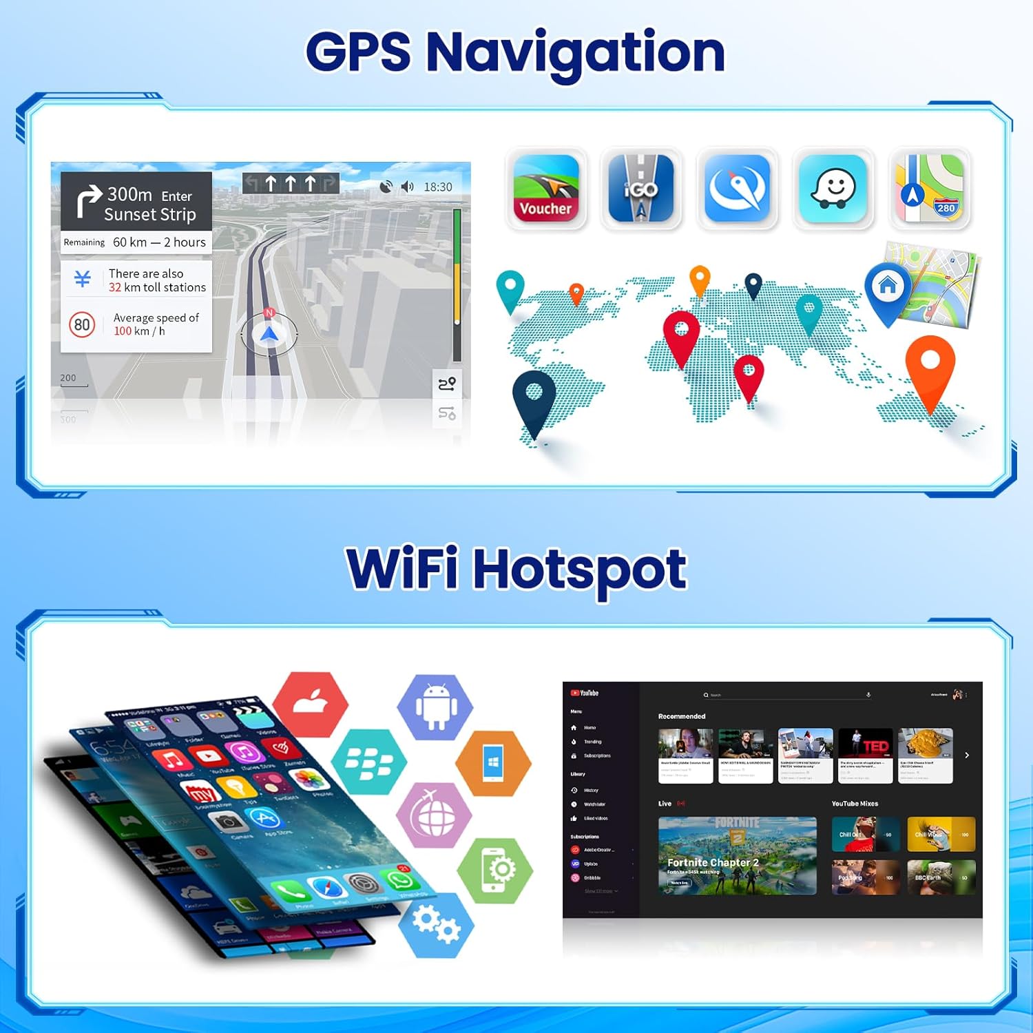 GPS Maps and WIFI: Carplay stereo support connecting to WiFi and cell phone hotspot, you can use online navigation, download any application in the application store to enjoy surfing the Internet and so on. Built-in “Herewego” offline map, you can view the map at any time without connecting to the Internet after downloading the data