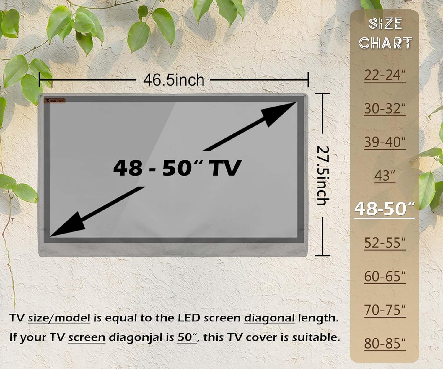 NOTE: If your TV has a soundbar, wide border, or thicker than usual, please measure the length and width of your TV’s outer frame and compare it to the size of TV cover (46.5″W x 27.5″H x 4.5″D) to ensure a proper fit.