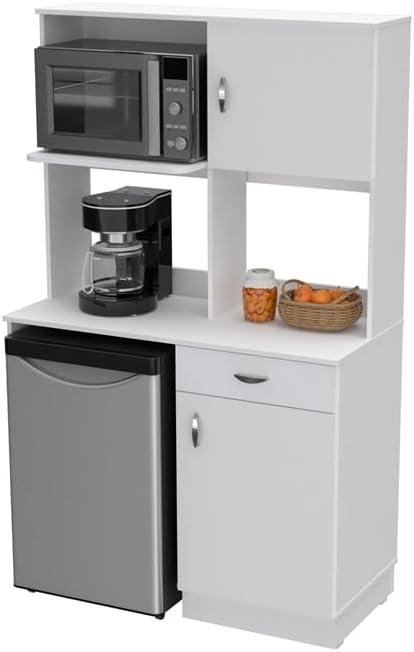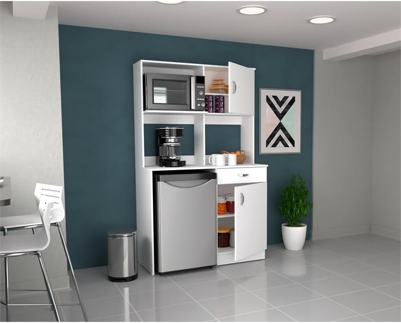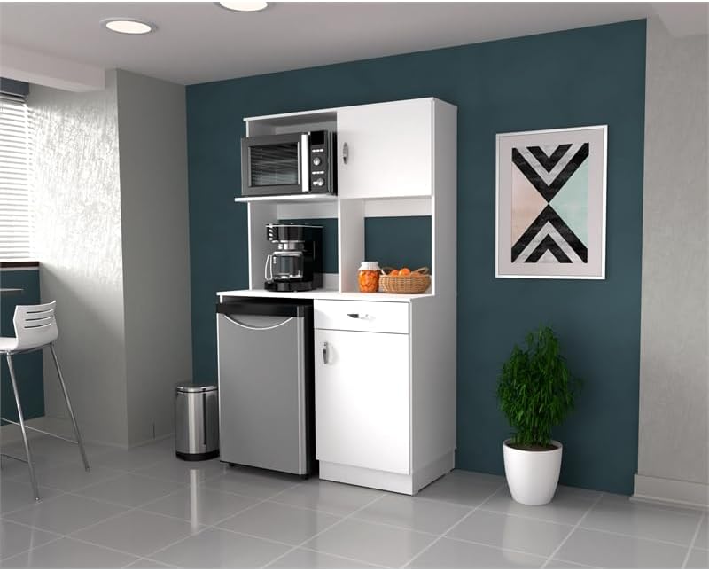 Combining functionality with modern design, the Inval Ambrossia Breakroom Kitchenette Cabinet is an ideal solution for compact kitchen or breakroom spaces. Finished in rich White laminate, this cabinet seamlessly blends sophistication with practicality. It includes a dedicated compartment for a mini refrigerator, a designated area for a microwave, and a well-appointed coffee station. The cabinet offers efficient organization with four shelves and one drawer that provides ample storage for snacks, supplies, and paper goods. The drawer and door feature chic brushed metal knobs and concealed European-style hinges, adding a sleek, modern touch. Constructed from high-quality manufactured wood laminated on both sides with durable melamine, the cabinet is stain, heat, and scratch-resistant, ensuring long-lasting durability. The adjustable feet ensure stability on any surface, and assembly is required. With overall dimensions of 16”H x 21.73″W x 14.92”D and a product weight of 88.18 lbs., this cabinet’s space-saving design efficiently maximizes your storage while enhancing your breakroom or kitchen with a touch of elegance. 1-year limited manufacturer warranty included.