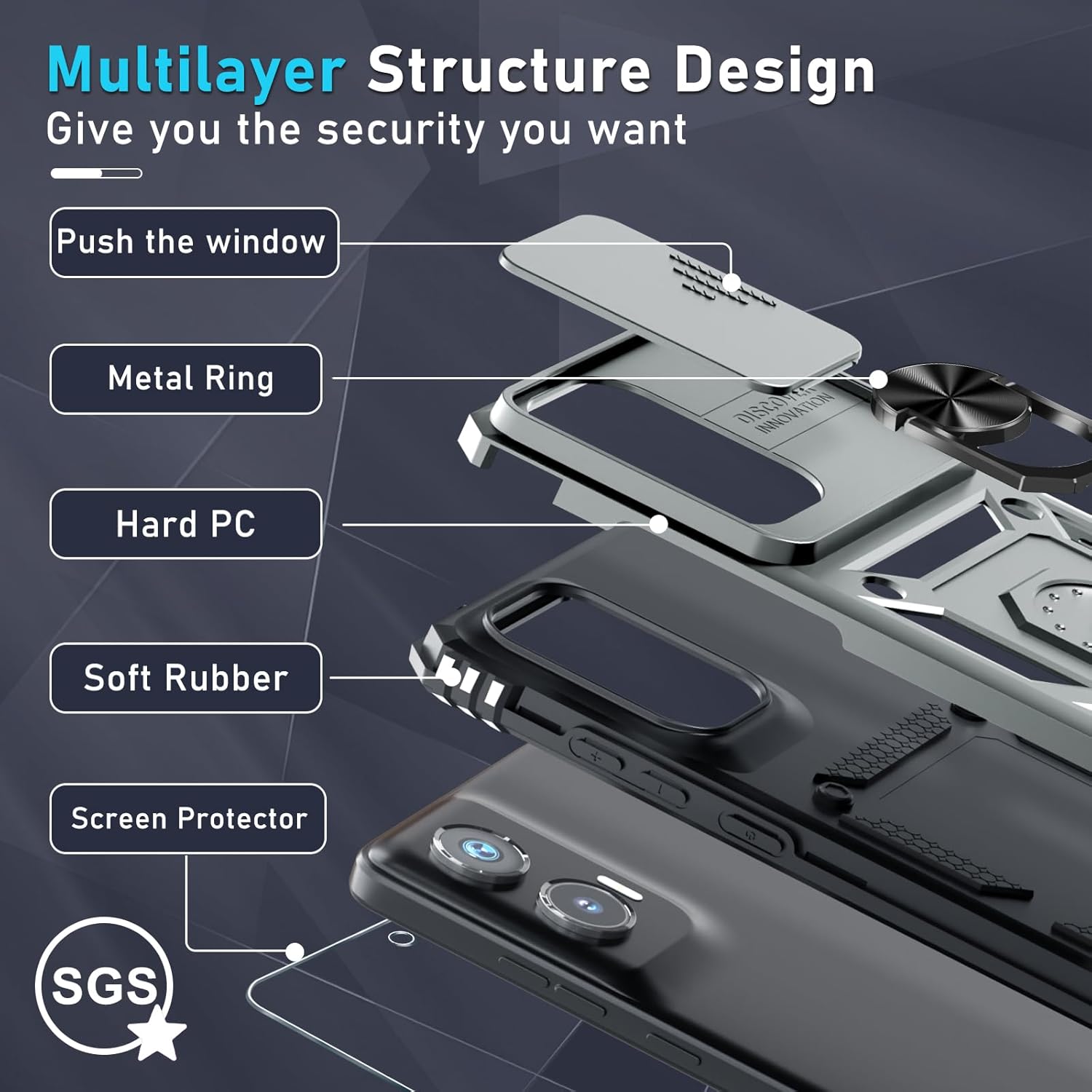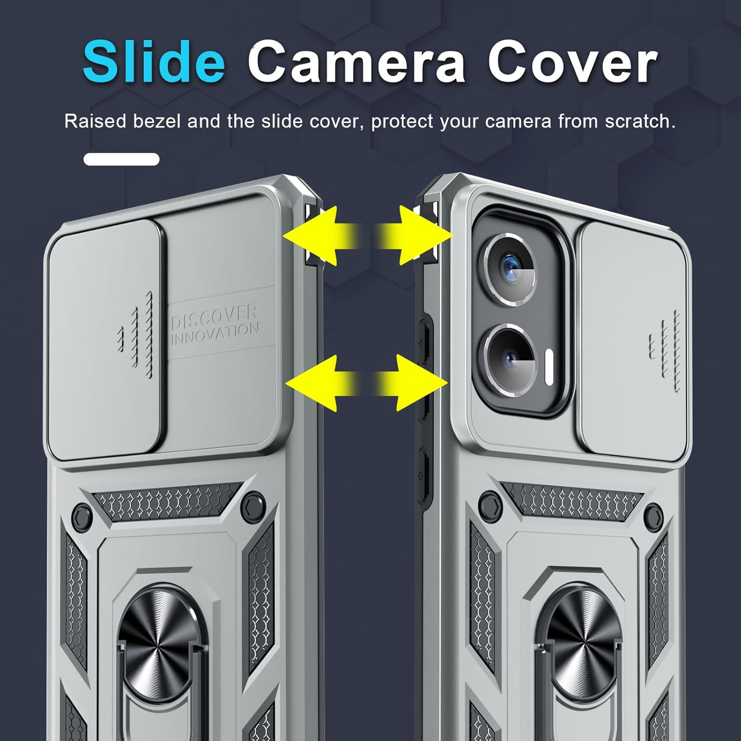 Janmitta Compatible with Moto G Stylus 5G 2024 Case Built in Slide Camera Lens Cover+Screen Protector+Finger Ring Holder Kickstand,Heavy Duty Shockproof Full Body Protective Phone Cover,Silver