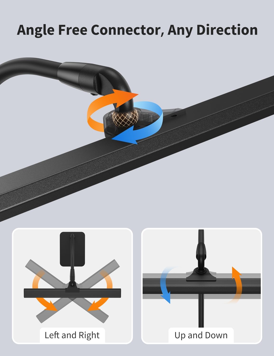 [ Adjustable Height & Any Direction ]: There is a clever gimbal between light body and light bar, you can adjust the direction of light within 270° to avoid lighting to eye.The gosseneck neck can be adjust from low to high(14-24.4in), easily compatible with large monitor like 30inch or the small one like 27in 24in 21in and laptop.