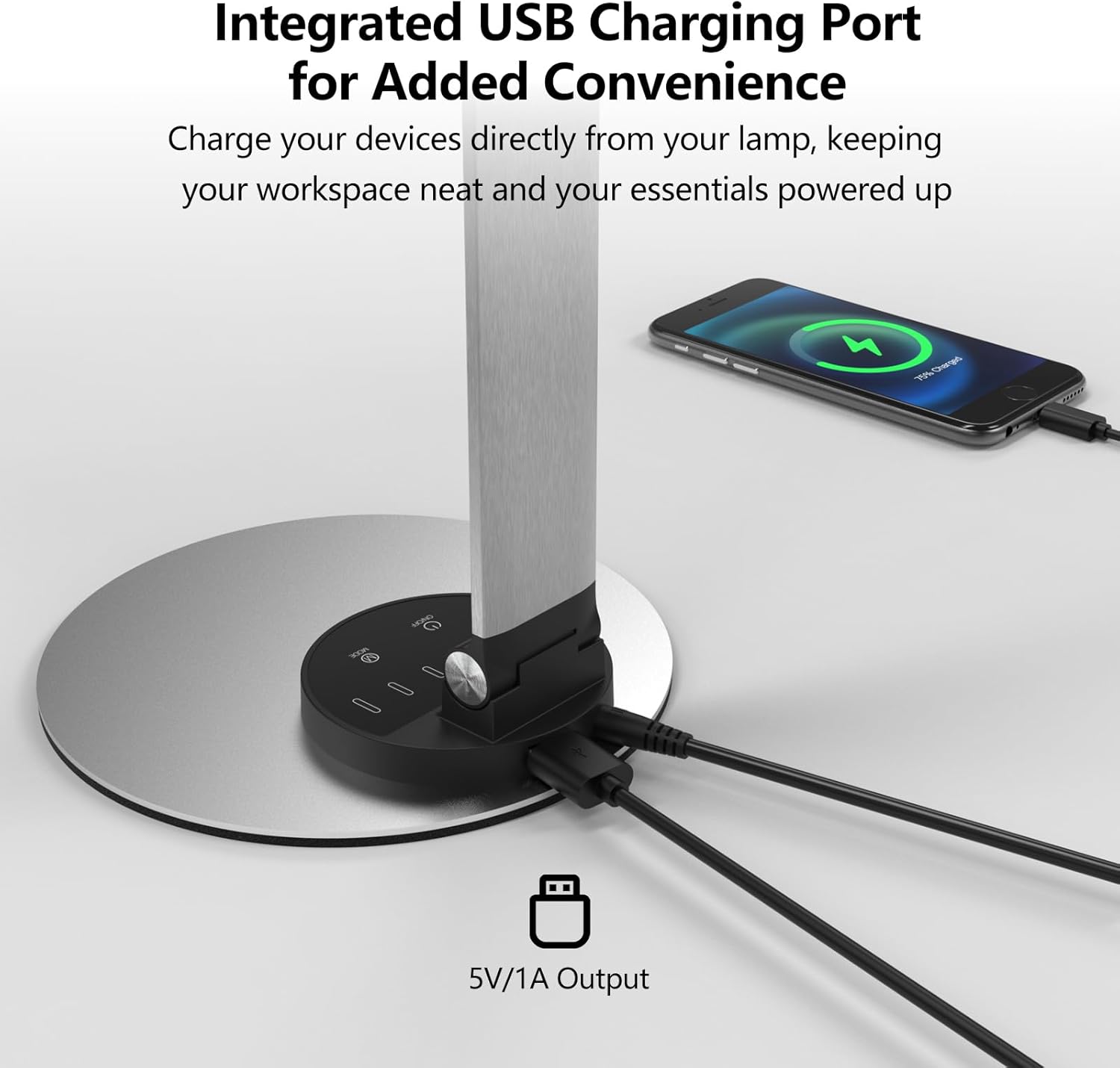 【Additional Charging Port】This adjustable desk lamp features a 5V/1A USB charging port, perfect for powering mobile phones, tablets, or speakers, while the DC adapter ensures reliable power. With its integrated charging solution, this desk lamp with charger combines functionality with modern design, making it a practical choice and a must-have for home offices and study areas