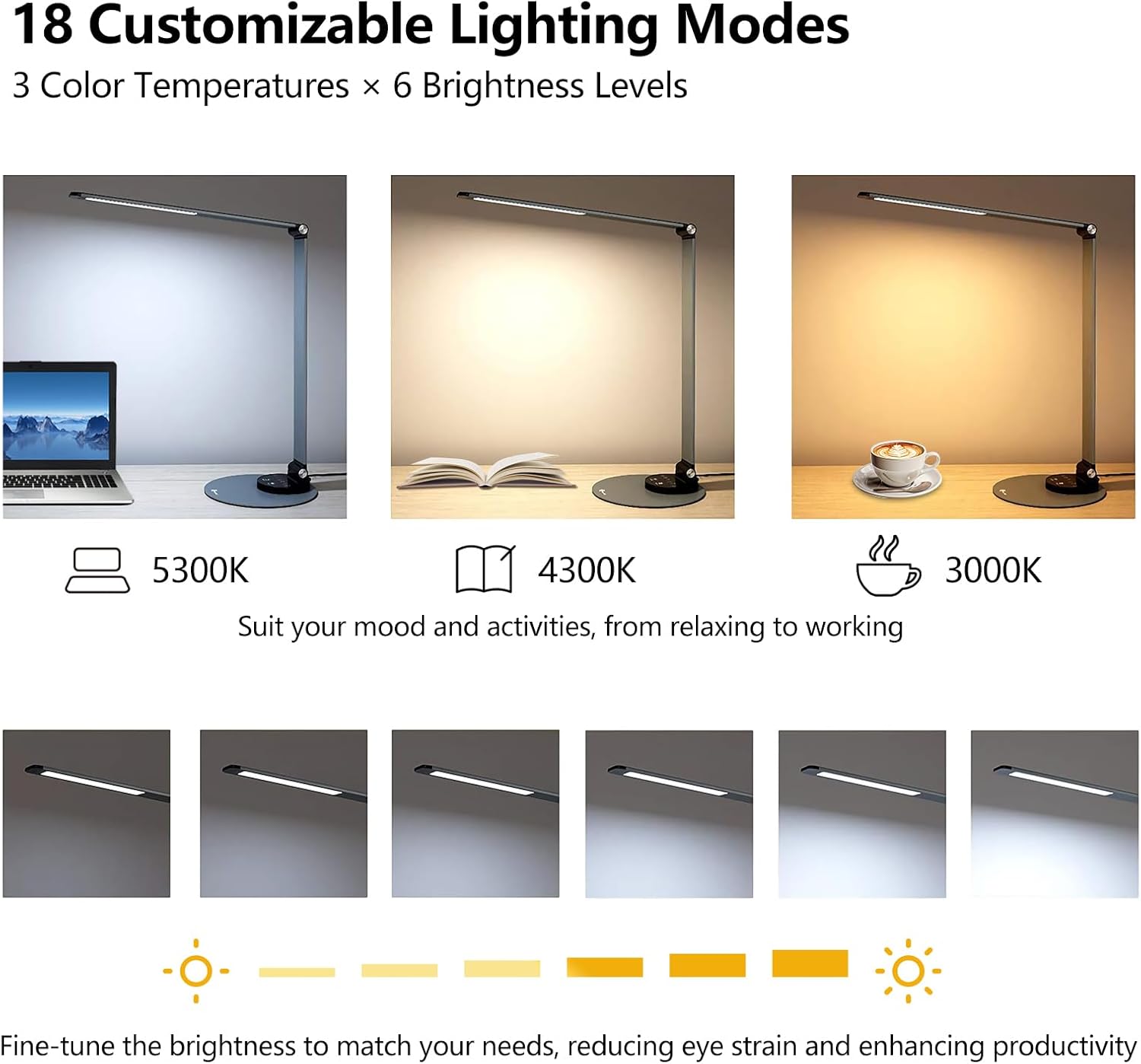 【18 Customizable Lighting Options】The dimmable desk lamp offers 3 adjustable color temperatures (3000K/4300K/5300K) and 6 brightness levels (10%-100%) without harsh change, providing 18 unique lighting combinations to perfectly suit any task, enhancing productivity and comfort with personalized lighting. Ideal for home offices, this reading lamp also features a memory function, remembering your last settings for effortless use each time you turn it on