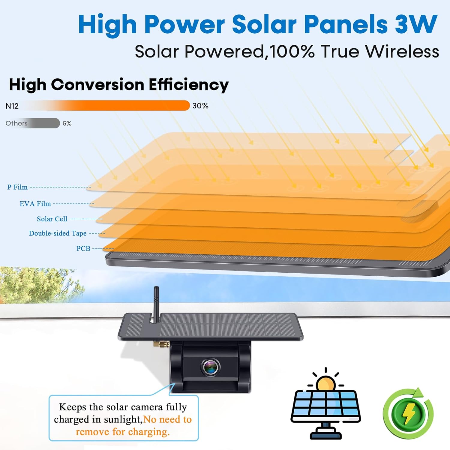 HD 1080P Clear Picture and Super Night Vision: Using the upgraded chip technology, solar wireless backup camera system kit can provide real-time and sharp pictures no matter in the day or at night. IP69K waterproof rating ensures reliable performance in all weather conditions. Wireless back up camera for trailer provide 170 degree wide view angle