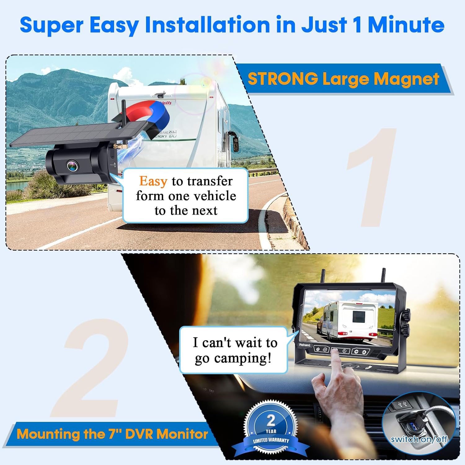 DVR Loop Recording and Expandable with 2 Channels: Built-in recording trailer backup camera system automatically overwrites old footage to keep recordings refreshed. RV backup camera wireless with monitor supports adding up to 2 cameras to the 7 inch screen and easily switching between them. Plug and play with USB cable to power monitor