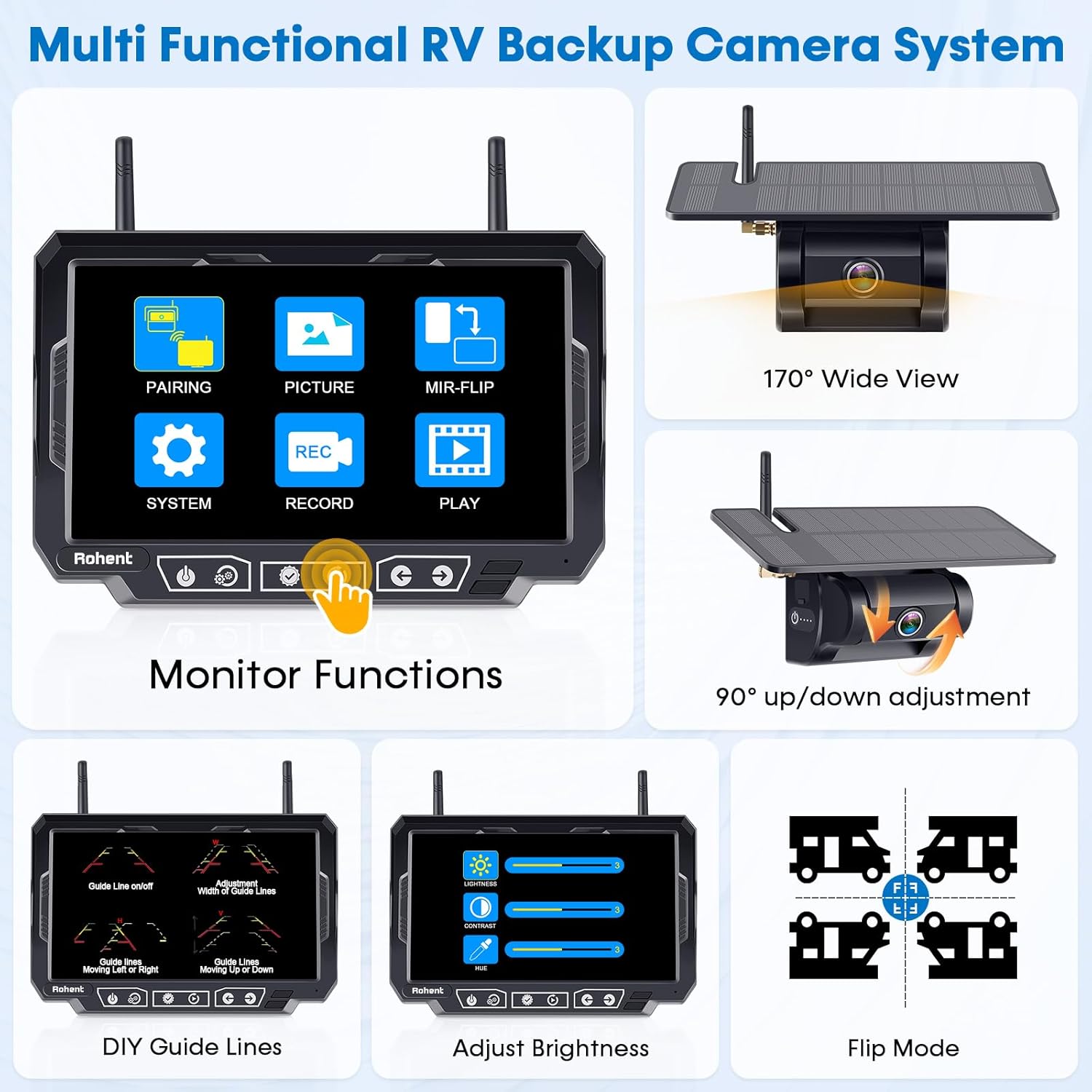 Magnetic Solar Wireless RV Backup Camera: 1Min DIY Installation 7″ DVR Monitor 15000mAh Rechargeable Battery HD 1080P 170° Wide View Hitch Rear View Camera System for RV Trailer Truck Rohent N12