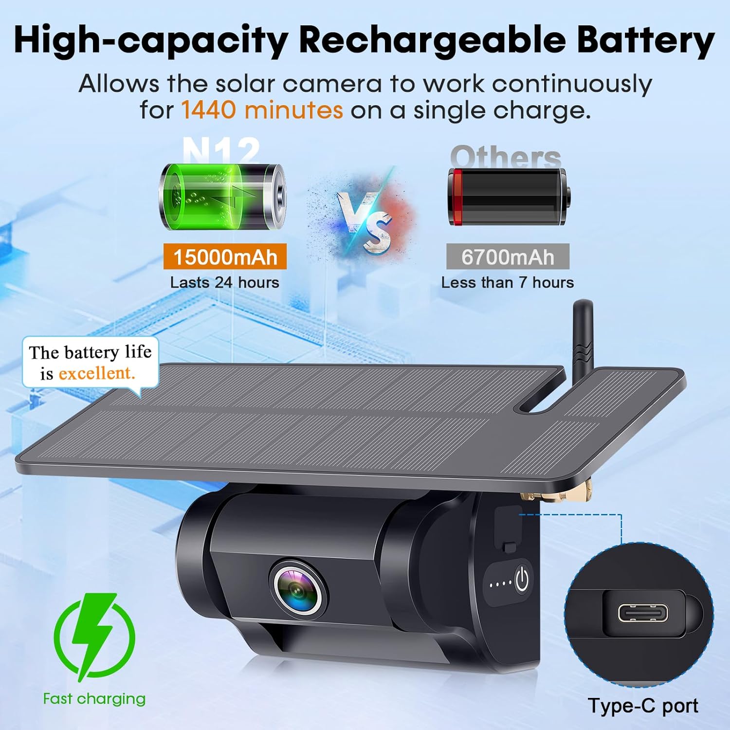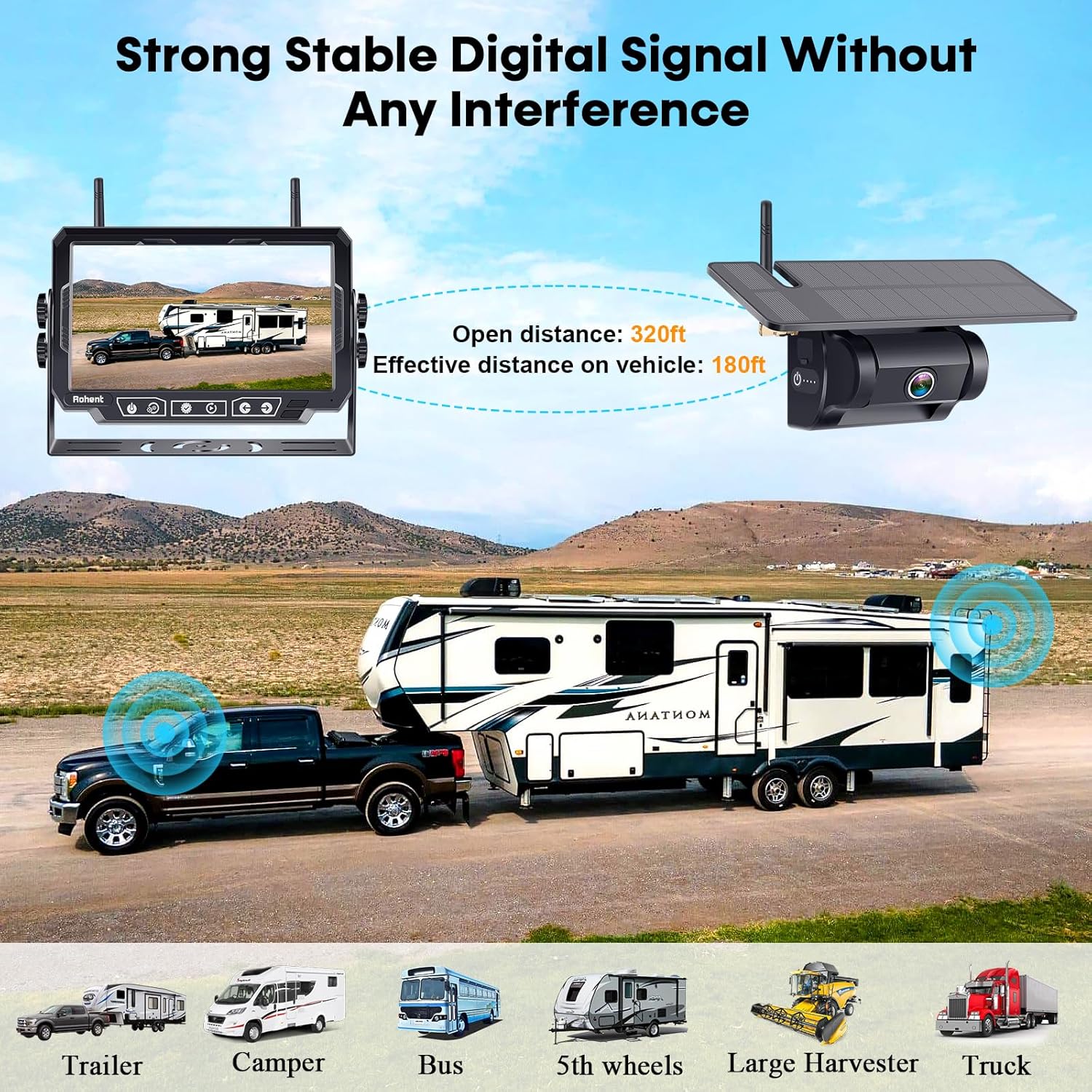 Rechargeable rv Backup Camera with Solar Powered: Built-in 15000 mAh rechargeable battery with solar panel power 3 W, energy-saving and environmentally friendly, which keeps the wireless backup camera fully charged in sunlight for your long-term traveling or driving needs
