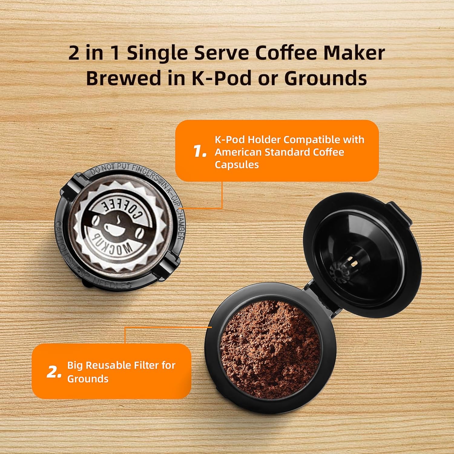 Multi-Functional Brewing: Horavie single serve coffee maker supports both k pod and ground coffee, offering flexible brew sizes from 6 to 12oz to meet your varying coffee needs. Whether you want a quick cup or to savor a slow drink, it handles both with ease