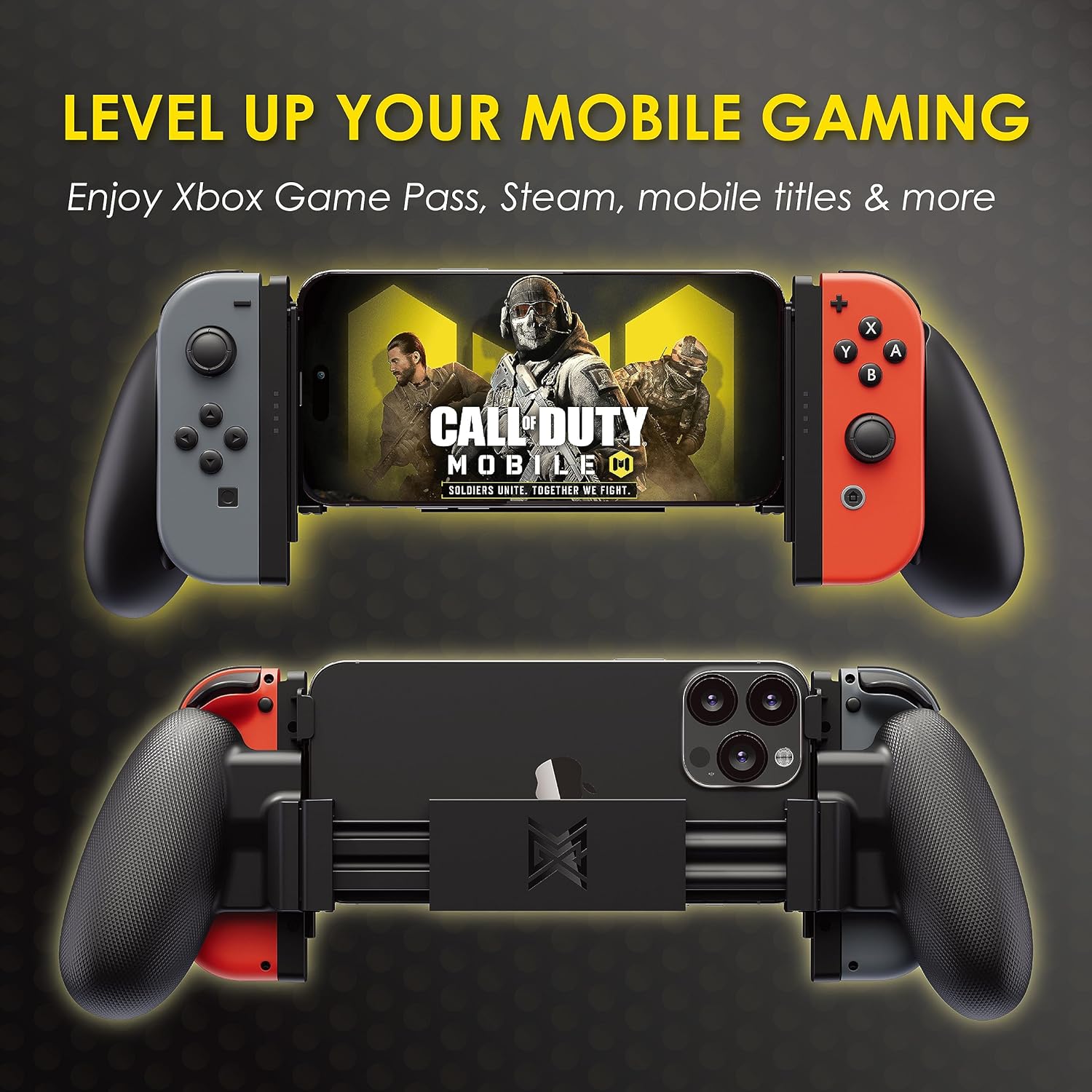 Transforming 3-in-1 Grip: The MGC PROTEUS Grip is compatible with Nintendo Switch Joy-Con controllers (not included) for play on both Switch console and iPhone mobile phones, providing a secure and comfortable grip while offering a range of convenient gaming experiences in both Switch games and mobile games like Call Of Duty Mobile.