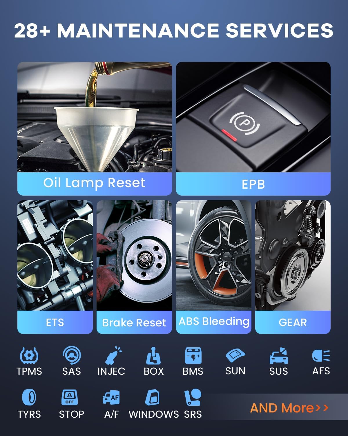 [28+ Maintenance Functions]The obd2 scanner provides 28 reset services for maintaining your cars efficiently, including Oil, EPB, TPMS, SAS Calibration, Injector Coding, FABS Bleeding, Battery Registration, Throttle Body Relearn, Headlight, Gear Learn, Gearbox, Suspension, Sunroof Initialization, Transport Mode, etc.