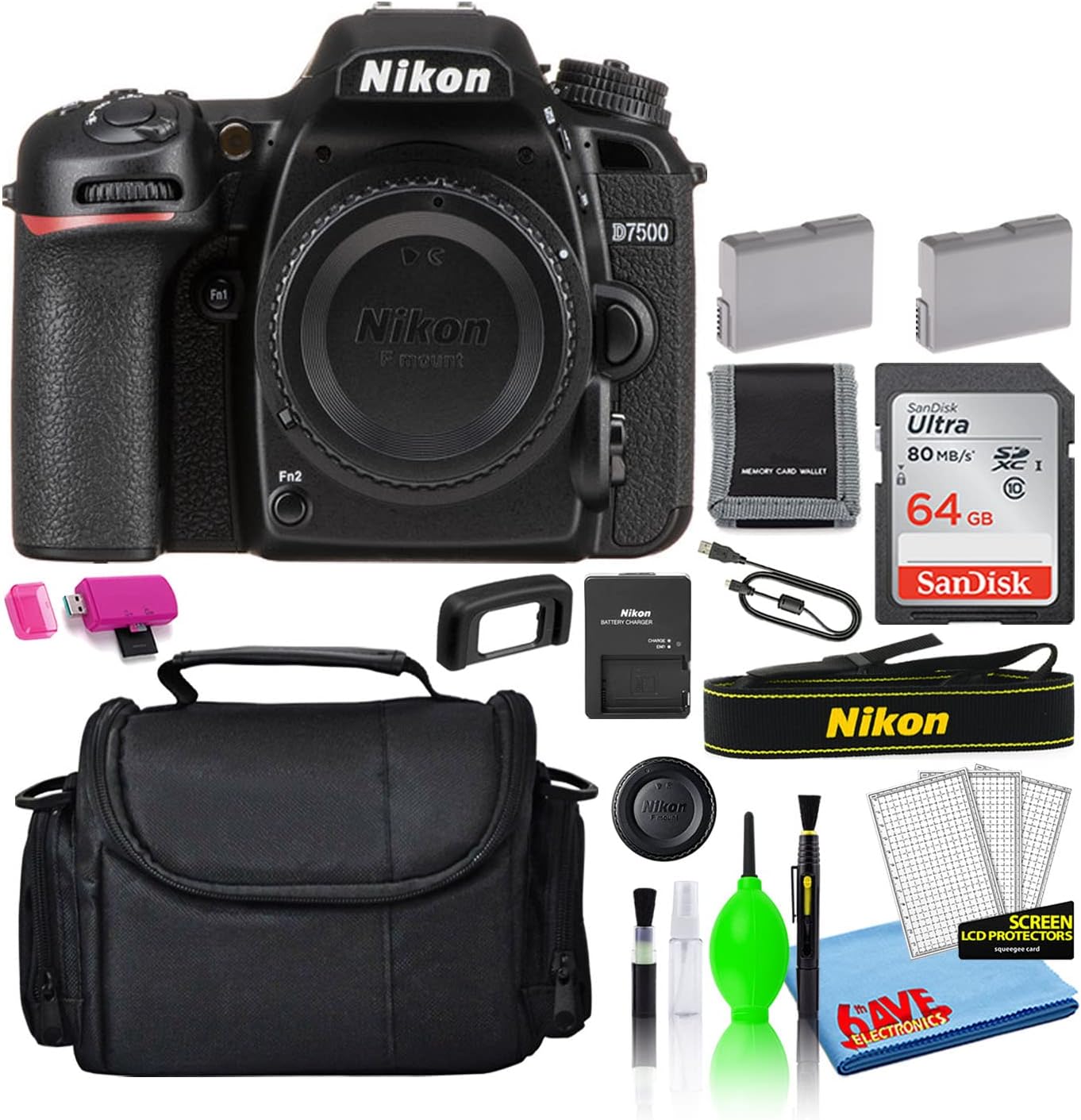 THIS NIKON CAMERA BUNDLE CONTAINS: Nikon D7500 DSLR Digital Camera (Body Only) + SanDisk 64GB Ultra SDHC SD Memory Card + EN-EL15 Compatible Lithium-Ion Battery + Large Digital Camera Gadget Bag + USB SD Card Reader + Memory Card Wallet + Deluxe Cleaning Kit + More