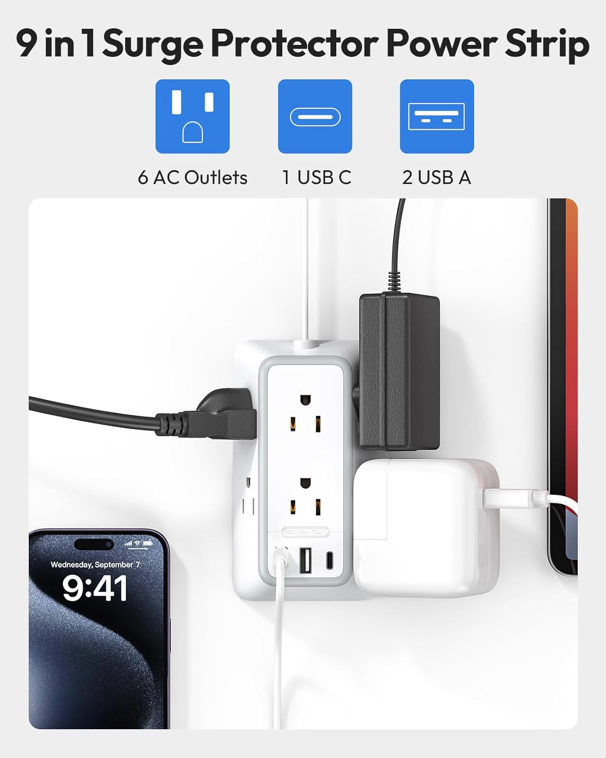 9-in-1 Power Strip with USB C port: 6 AC outlets, 2 USB-A ports and 1 USB-C port can power up to 9 devices at the same time. Using USB ports of this flat power strip plug you can save a lot of adapters to connect devices, making charging easier and saving space on your desktop.