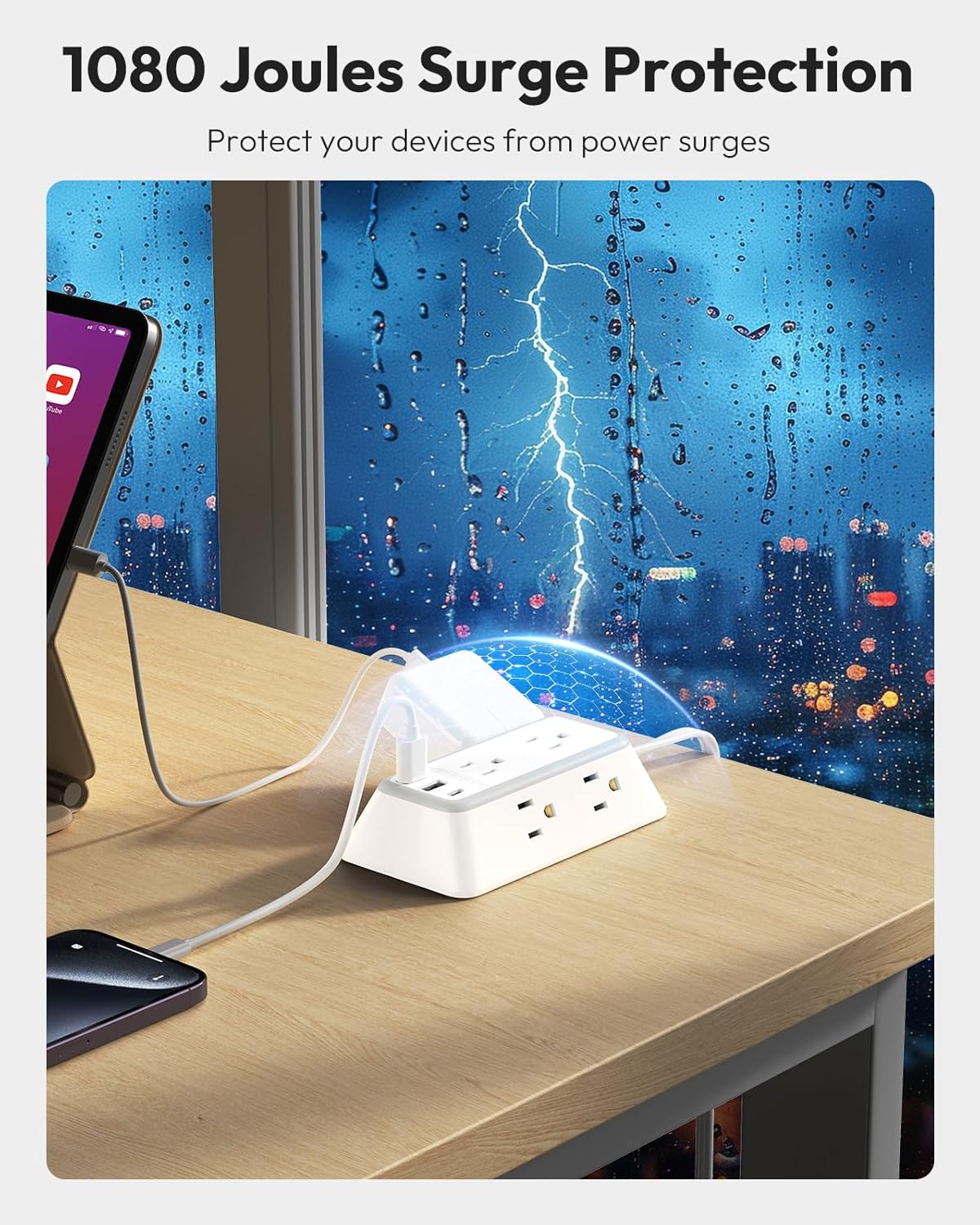 1080 Joule Overload Protection: This usb surge protector power strip is equipped with overvoltage protection of up to 1080 joules, A built-in safety gate automatically shuts off power in the event of an overvoltage or short circuit. Our 10 ft surge protector power strip protect your electronic devices from harmful voltage spikes.