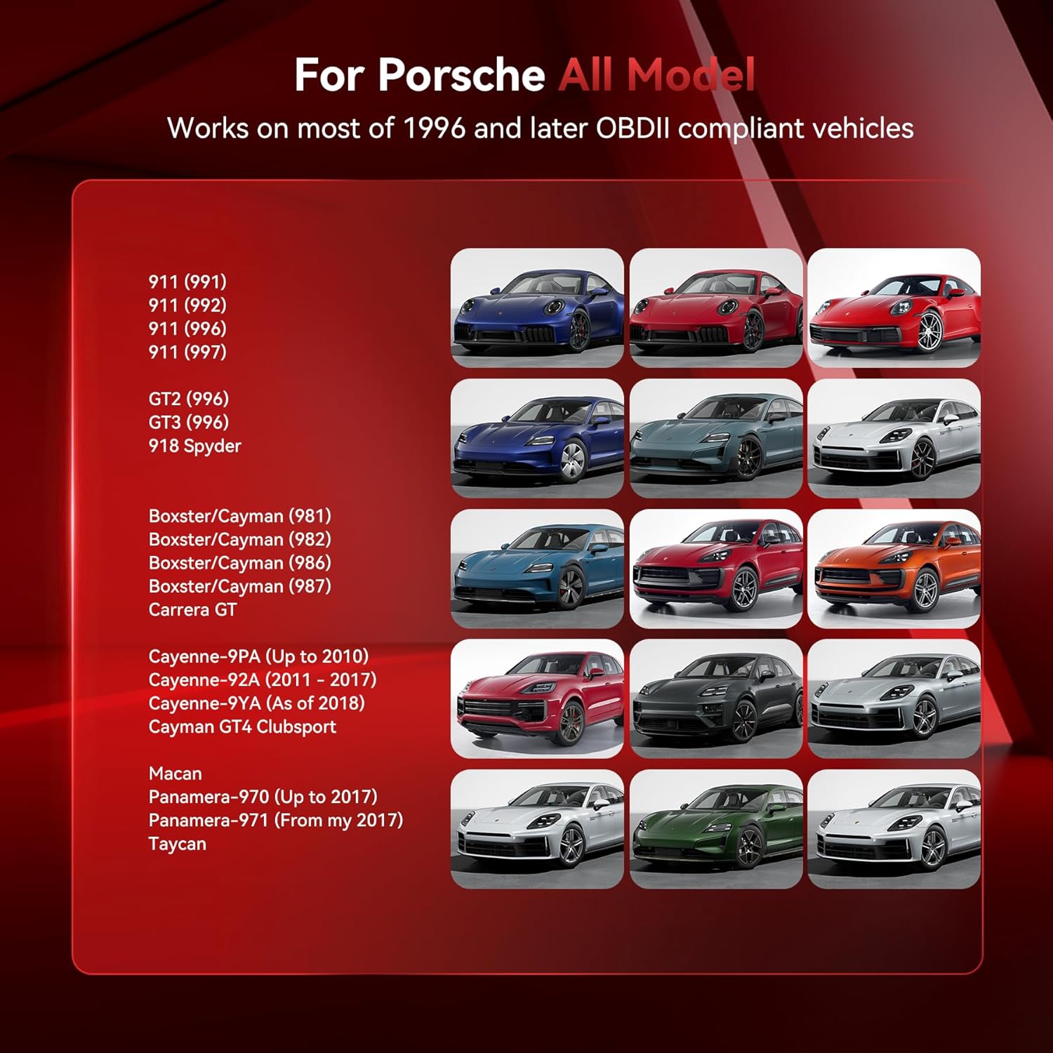 COVER ALL MODELS AFTER 1996 -iCarsoft POR II car diagnostic scanner updates more car models , such as for 911 (991); 911 (992); 911 (996); 911 (997); GT2 (996); GT3 (996); 918 Spyder; Boxster/Cayman (981); Boxster/Cayman (982); Boxster/Cayman (986); Boxster/Cayman (987); Carrera GT; Cayenne-9PA (Up to 2010); Cayenne-92A (2011 – 2017); Cayenne-9YA (As of 2018); Cayman GT4 Clubsport; Macan; Panamera-970 (Up to 2017); Panamera-971 (From 2017); Taycan and so on.