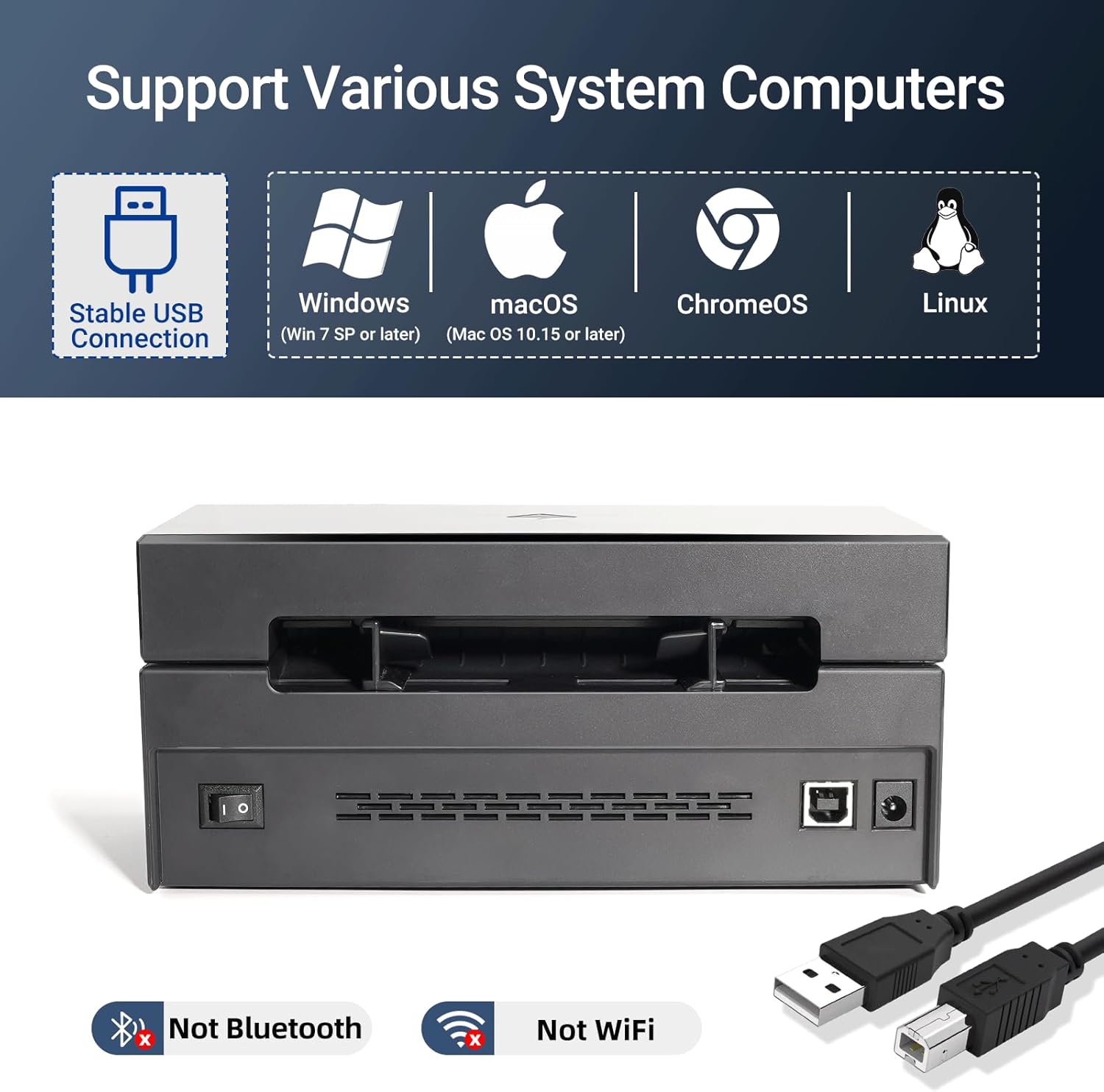 Easy to Use: This ORGBRO shipping label printer is compatible with Windows (Windows 7 SP, Windows10 X86/X64, Windows 11 X64), Mac OS (Mac OS 10.15, Mac OS 11.2.1, Mac OS 12.6.2, Mac OS 14.1), Chrome OS and Linux systems; Simple setup – connect via USB to your PC or laptop and download the driver (Note: USB connection ONLY); Print shipping labels, warehouse labels, Amazon FBA labels, barcodes, and more