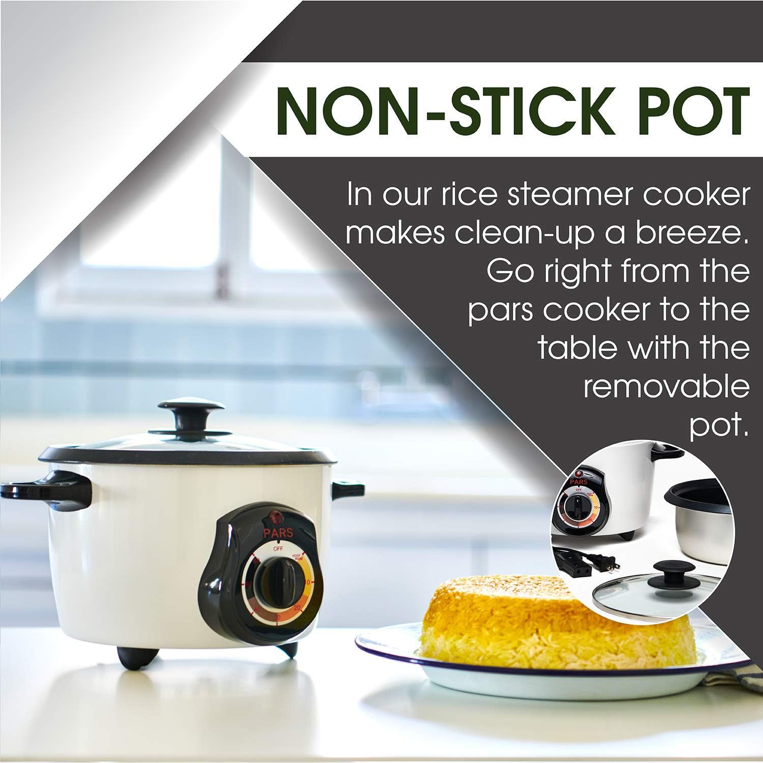 NON-STICK POT in our rice steamer cooker makes clean-up a breeze. Go right from the pars cooker to the table with the removable pot. Afterward, add the pot to your dishwasher and enjoy more time with family and friends.