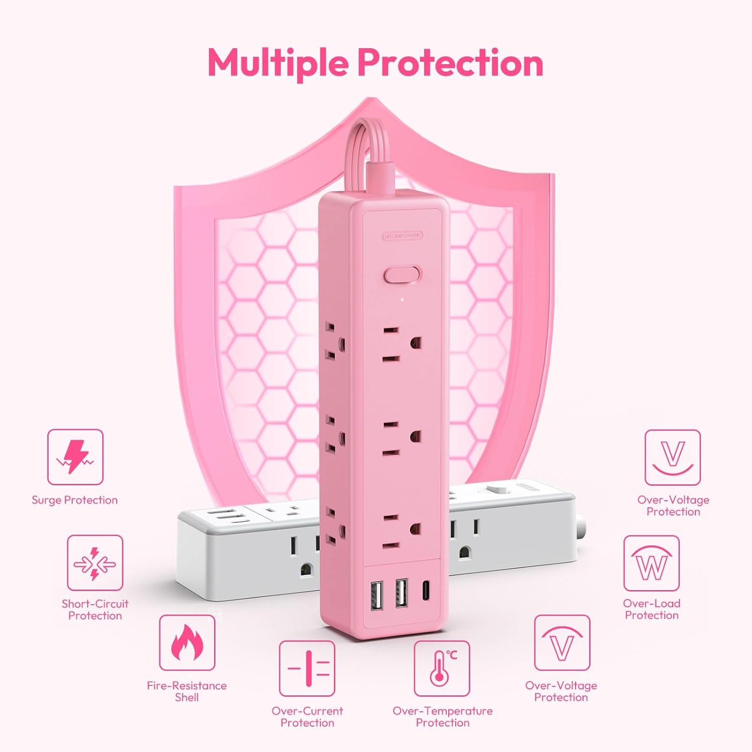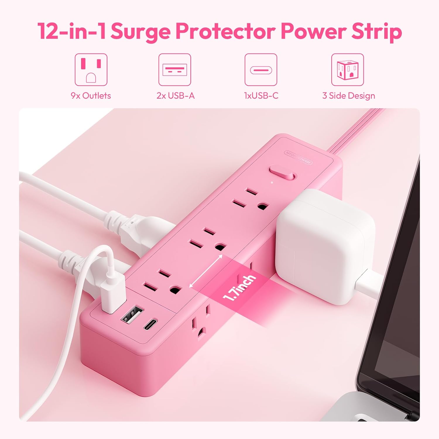 Pink Power Strip, NTONPOWER Surge Protector Power Strip 5FT Flat Extension Cord, 9 Outlets 3 USB Ports(1 USB C), Wall Mount, 1080J, Multiple Outlets for Home Office, Vanity Desk, Nightstand,Women