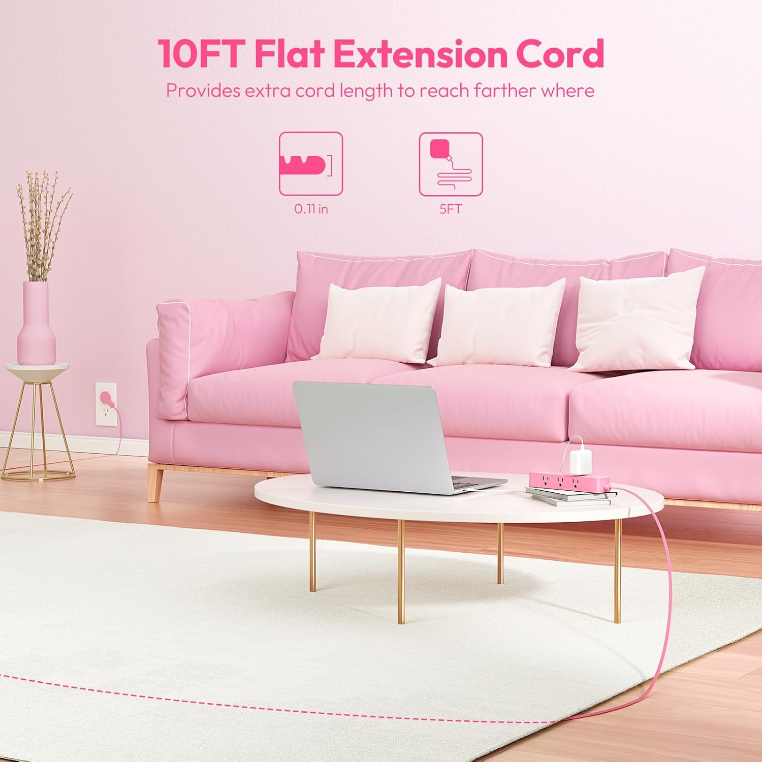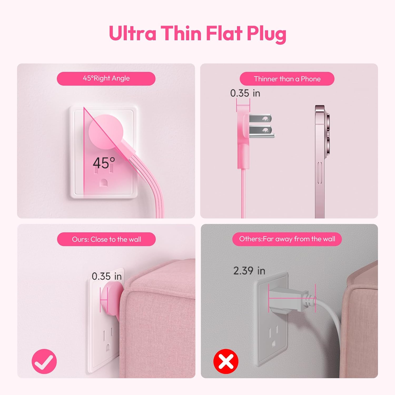 【Flat Extension Cord &Wall Mount】:5ft pink extension cord is more flexible. while the 0.11-inch ultra-thin flat extension cord is flatter and more flexible than traditional round extensions. can be hidden under the carpet. The wall mount power strip back has two mounting holes (includes 2 screws and mounting template). this slim power strip can be installed in narrow applications, saving you space, such as behind a bed, behind the sofa, bookcases, and under workbenches…