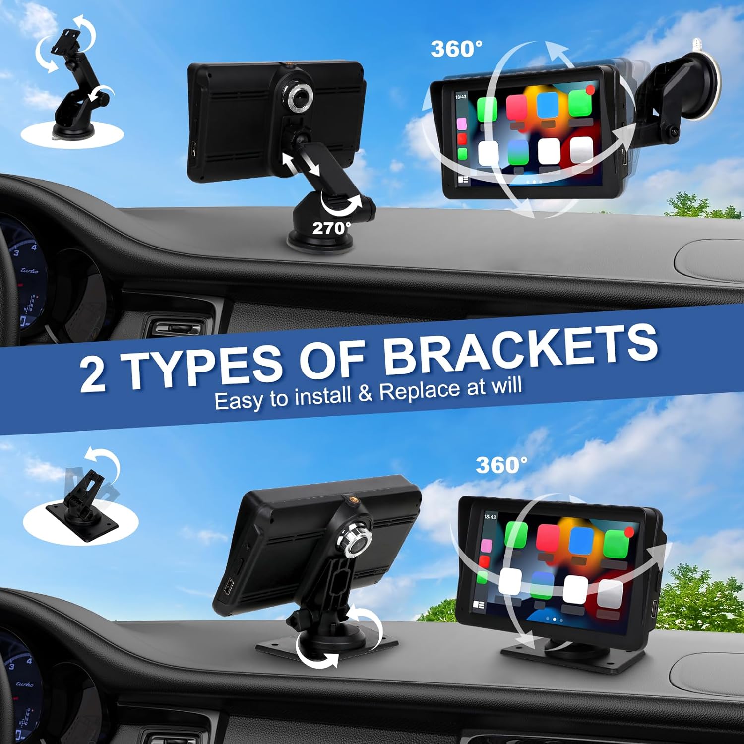 【Easy Installation】This portable car stereo includes 2 stable holders for flexible installation and angle adjustment, ensuring the screen remains secure even on bumpy rides