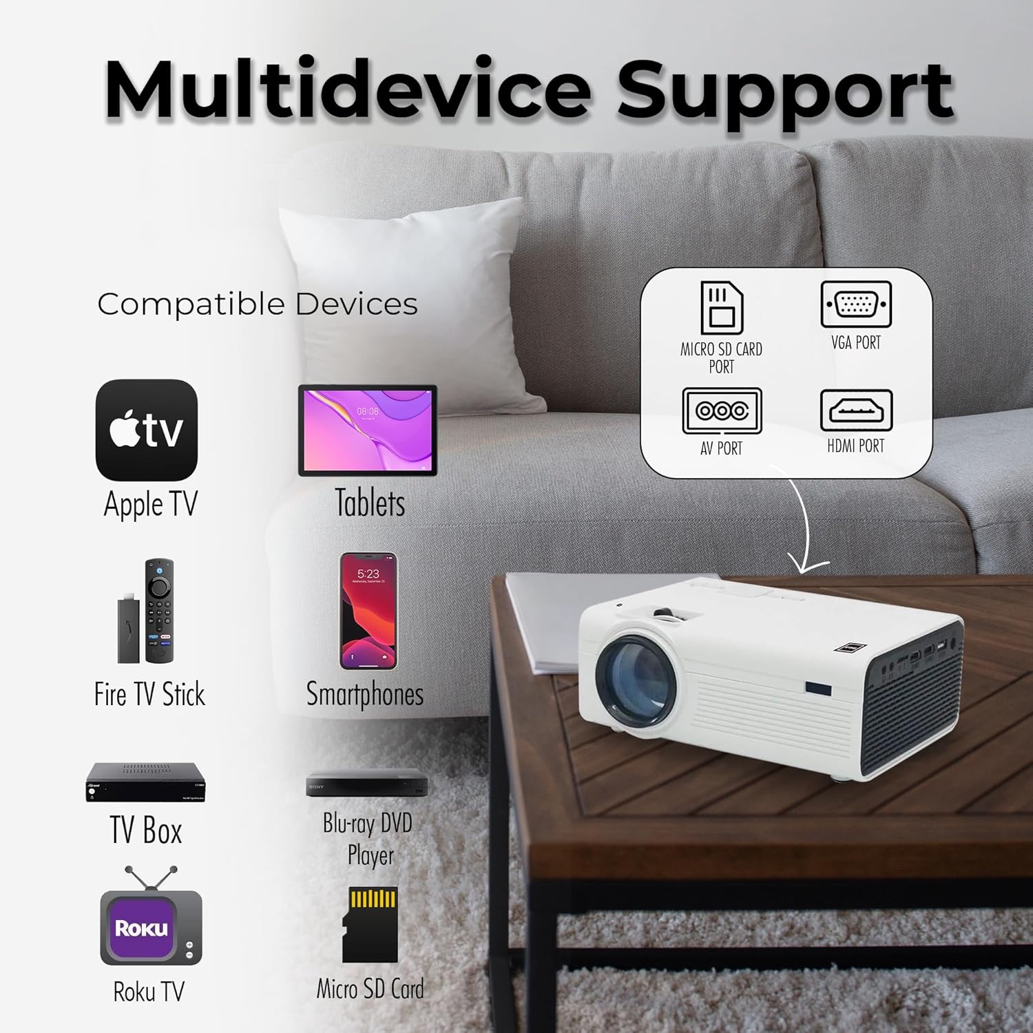VERSATILE MULTIMEDIA COMPATIBILITY – Our home movie projector connects seamlessly with a range of devices, including Roku TV, Blu-Ray Player, Apple TV, Fire Stick, iPhone, Android, Smart TV, and other streaming devices. Enjoy hassle-free connections with dual HDMI ports, A/V input, USB, VGA, and an SD card slot, ensuring compatibility with many video, audio, and image formats. Check the full list in the description for more details.