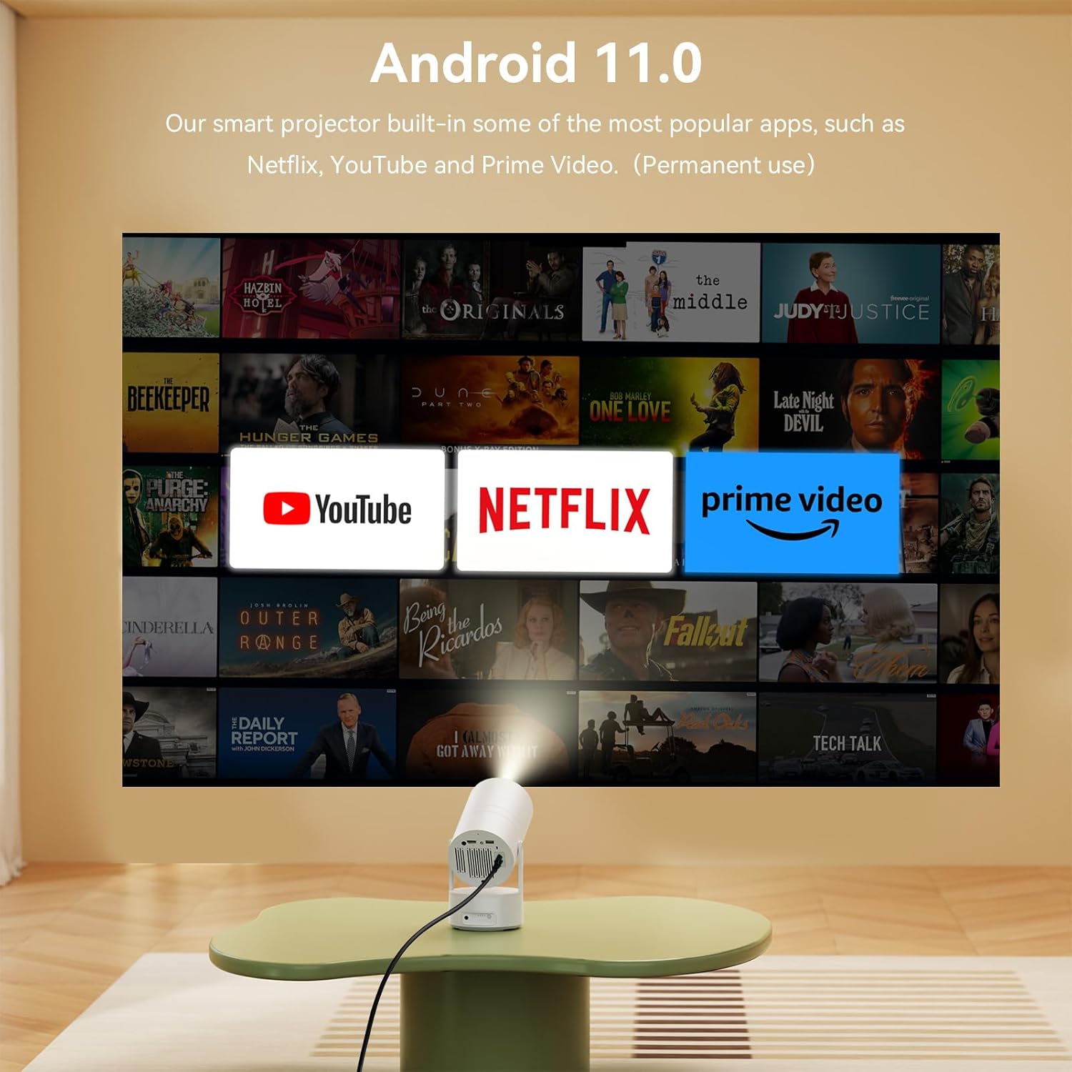 【Android 11 & Electric Focus】The Polocsh mini projector build-in Android 11, giving access to Netflix, Prime Video, YouTube, and 10,000+ channels and videos. Easily adjust focus in 2 seconds using the F+ or F- buttons on the remote, for quick and clear images.