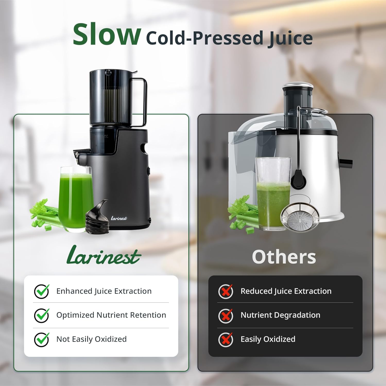 Cold pressing vs other centrifugal juicers: extend the shelf life of freshly squeezed fruits and vegetables juice, more original flavor, higher juice yield.