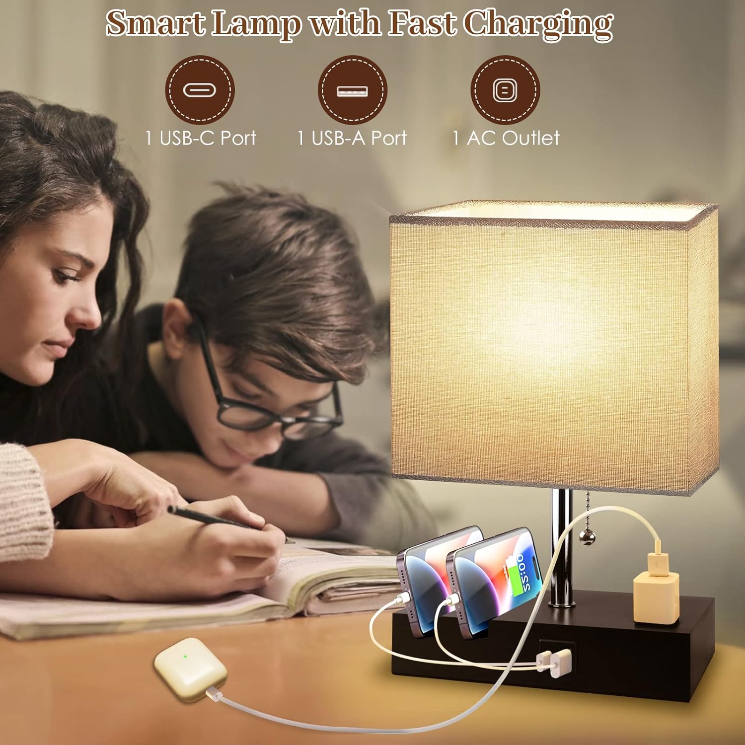 Charging Ports and Phone Stands: Feature with (5V/2.1A) 1 x USB-C, 1 x USB-A, and 1 x AC outlet charging options, this table lamp can charge your phone, tablet, kindle reader, and smartwatch at the same time. The phone stands make your bedside space neat. You can also power your candle warmer, essential oil diffuser, or another device, no more worry about the power outlet being far away from your table or bedside, much more convenient