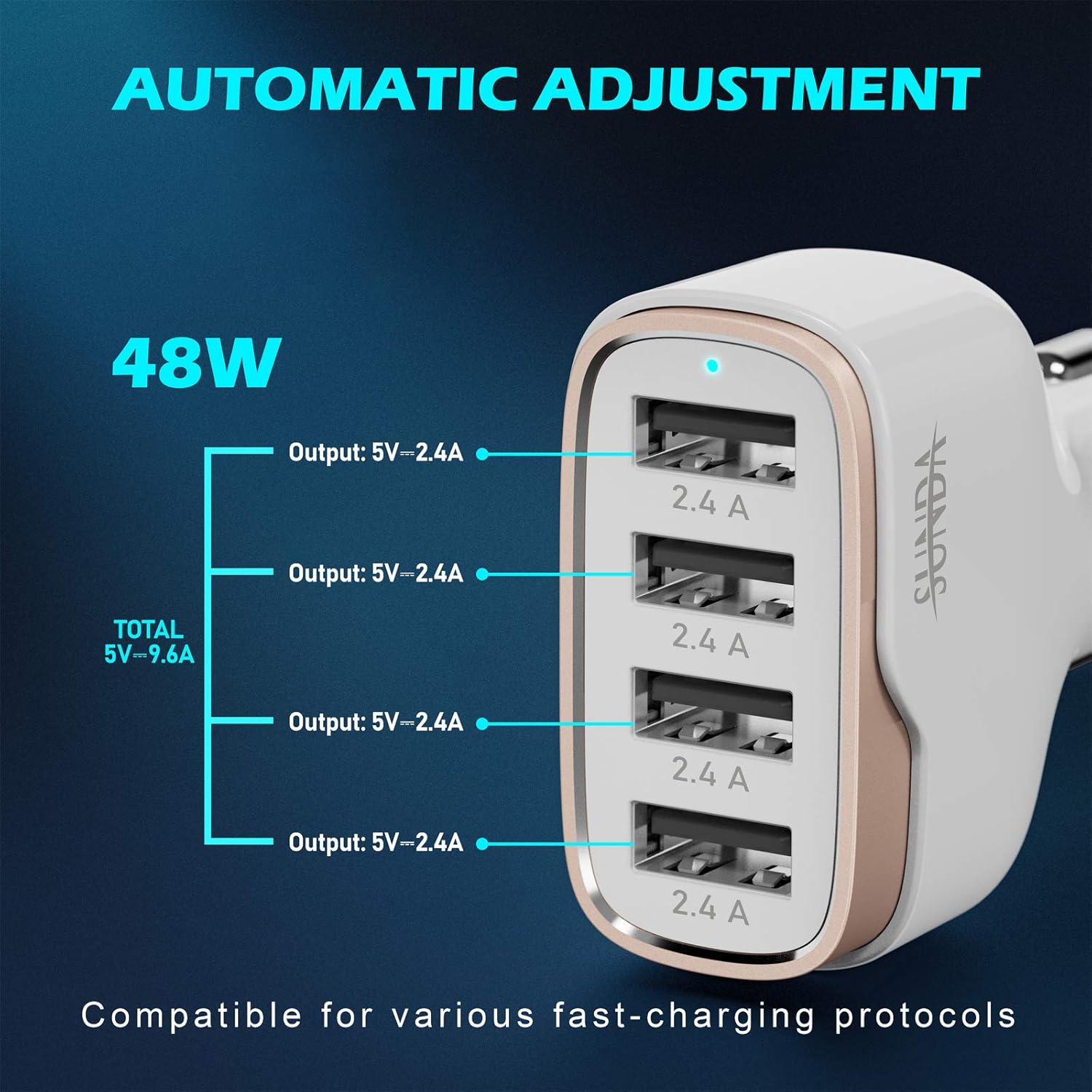 SUNDA 48W/9.6A USB Fast Car Charger, 4-Ports Car Charger Adapter for Apple and Android Smart-Phones, Car Phone Smart Charger Compatible with iPhone15/14 Pro/Max/iPhone 13/Pad Pro/Galaxy/Samsung