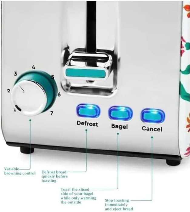 Beautiful stainless steel 2-slot toaster featuring sweet rose print Includes turn-dial timer and 3 button functions: Cancel, defrost, and bagel Turn-dial timer allows you to choose from 7 different shading levels