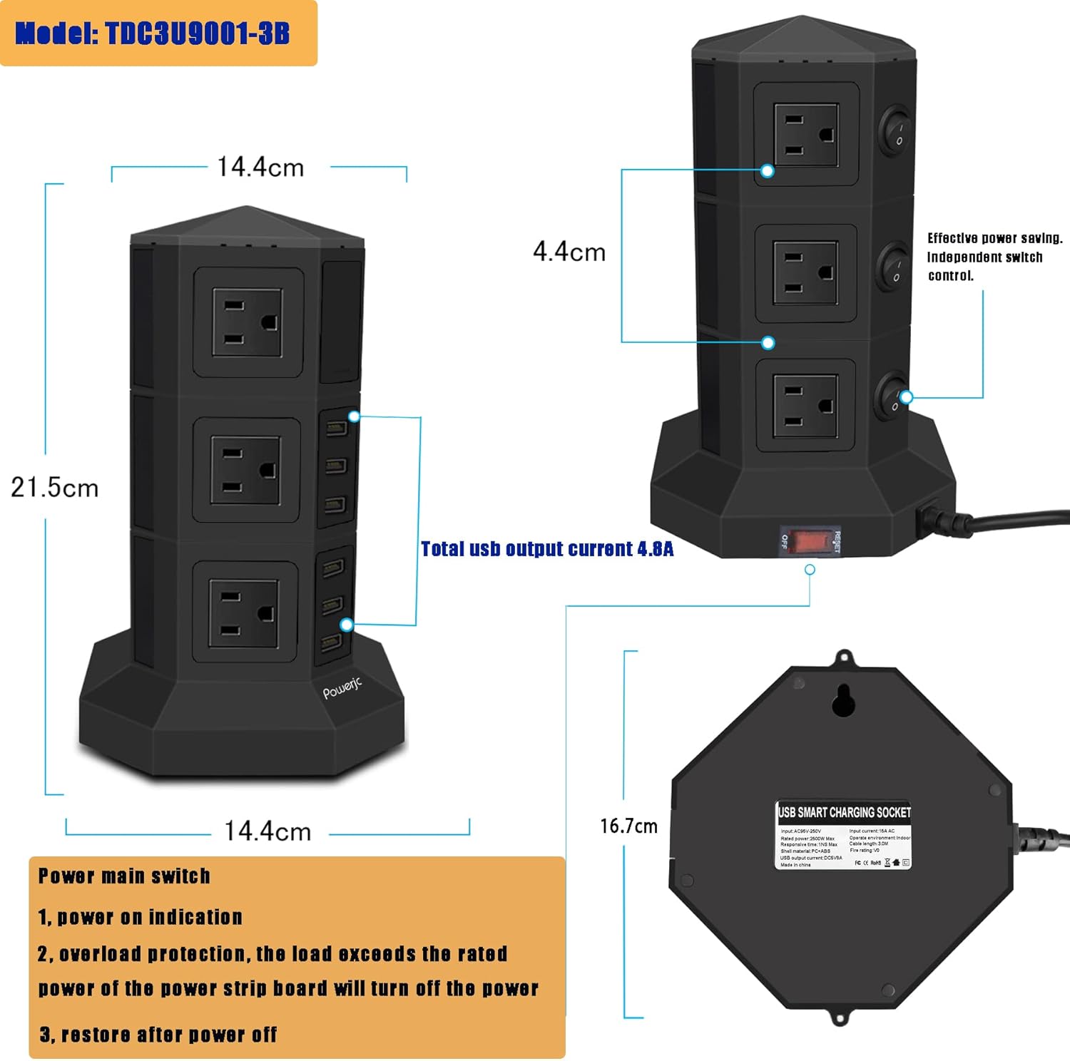 ●【Unique Design】: Comparing with traditional power strips, vertical tower shape design provides enough space for each outlet, and saves much space; there is one switch at each layer helps to save electricity and gives an easy control to the power strip; there is a switch at the bottom to control 6 USB charging ports.