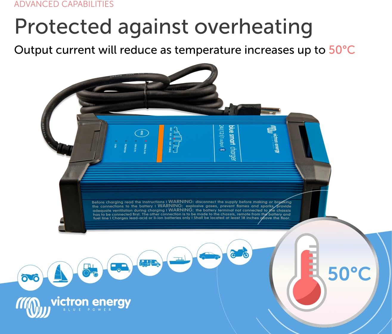 For all kind of devices and vehicles: Victron Energy Blue Smart IP22 battery charger can be used on devices in your workshop and on motor or marine vehicles, such as (classic) cars, camper-vans, boats, yachts and motorbikes