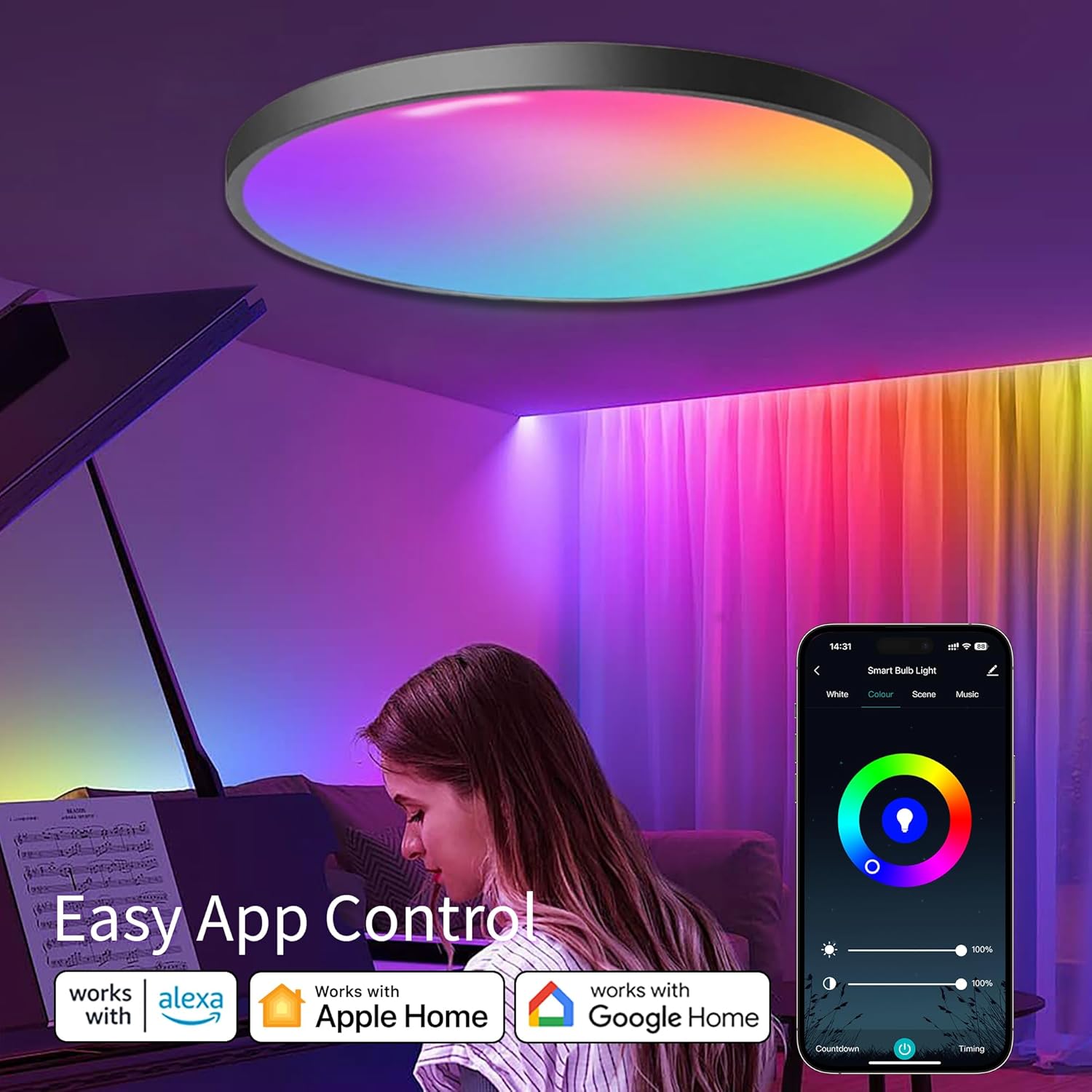【Voice Control】 Compatible with Apple Home/Siri, Amazon Alexa and Google Assistant. Voice commands of smart device to turn on/off the light, and change the colors, lightness and the mode of lighting. (Alexa, change the color of the living room light to red)