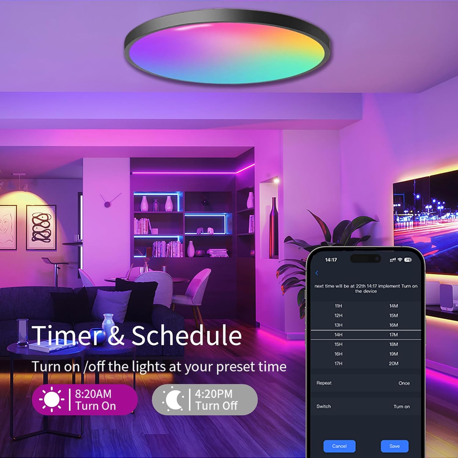 【Scene & Music Modes】With CozyLife App, you can set the ceiling light as the main device to sync the colors changing by following the music you choose as a light show.