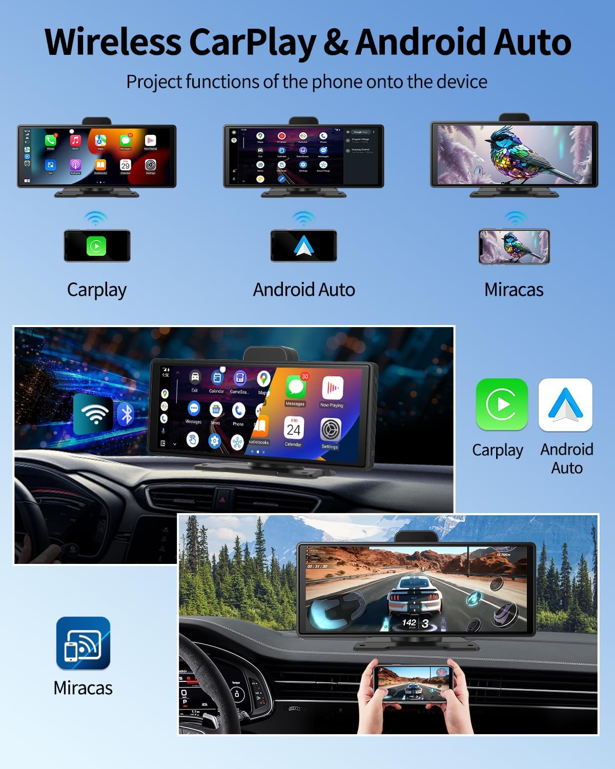 AirPlay/Android Miracast: Enhance your travel experience by connecting your phone to the portable CarPlay using AirPlay and Android Miracast. Project navigation maps, movies, videos, and games onto the 9-inch screen for smart navigation and high-definition entertainment.