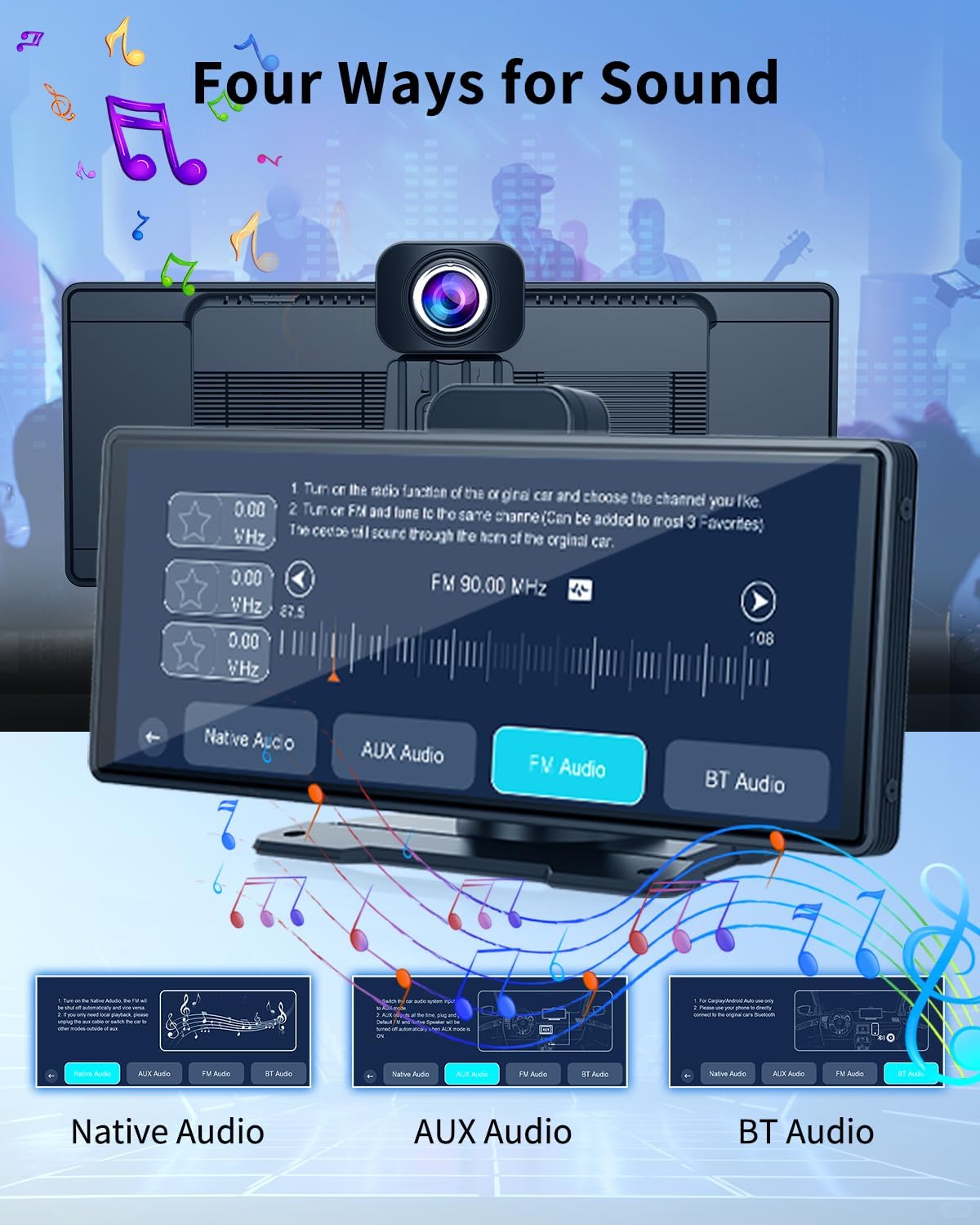 Four Audio Output Options: 1Use the built-in speaker of the portable car stereo. 2Sync the FM frequency with the car radio via the touch screen. 3Connect the AUX cable to the vehicle’s original AUX port for audio output. 4Link your iPhone to the car radio via Bluetooth (Bluetooth audio is only available for CarPlay, not Android Auto). The last three options allow audio output through the car’s original speakers.