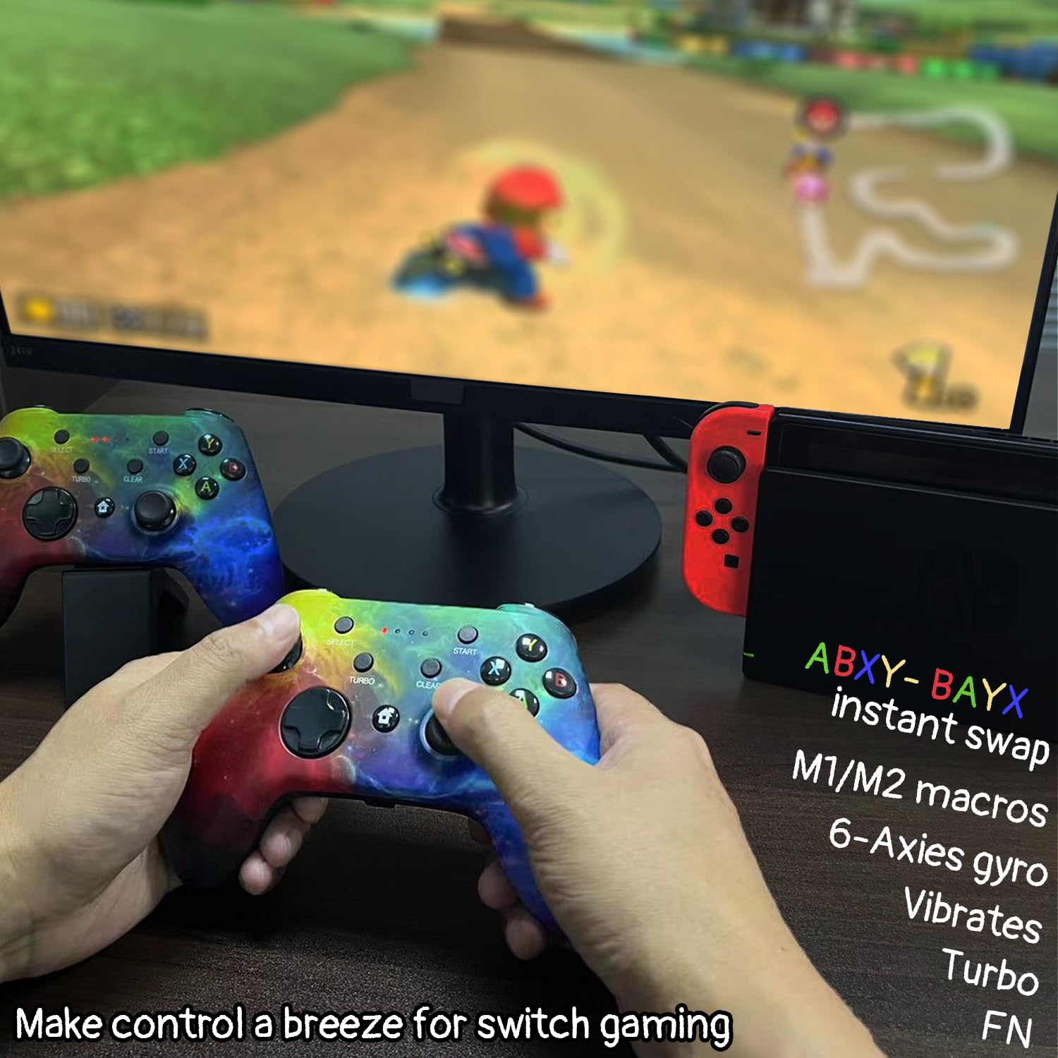 Supports Bluetooth and wired connections, automatic identificationWired connection is successful, unplug the cable and automatically switch to wireless controllerCan use the clear (FN) key to take screenshotsSupport switching BAYX to ABXY at any time during the gameSupports automatic wake-up of Switch after reconnection