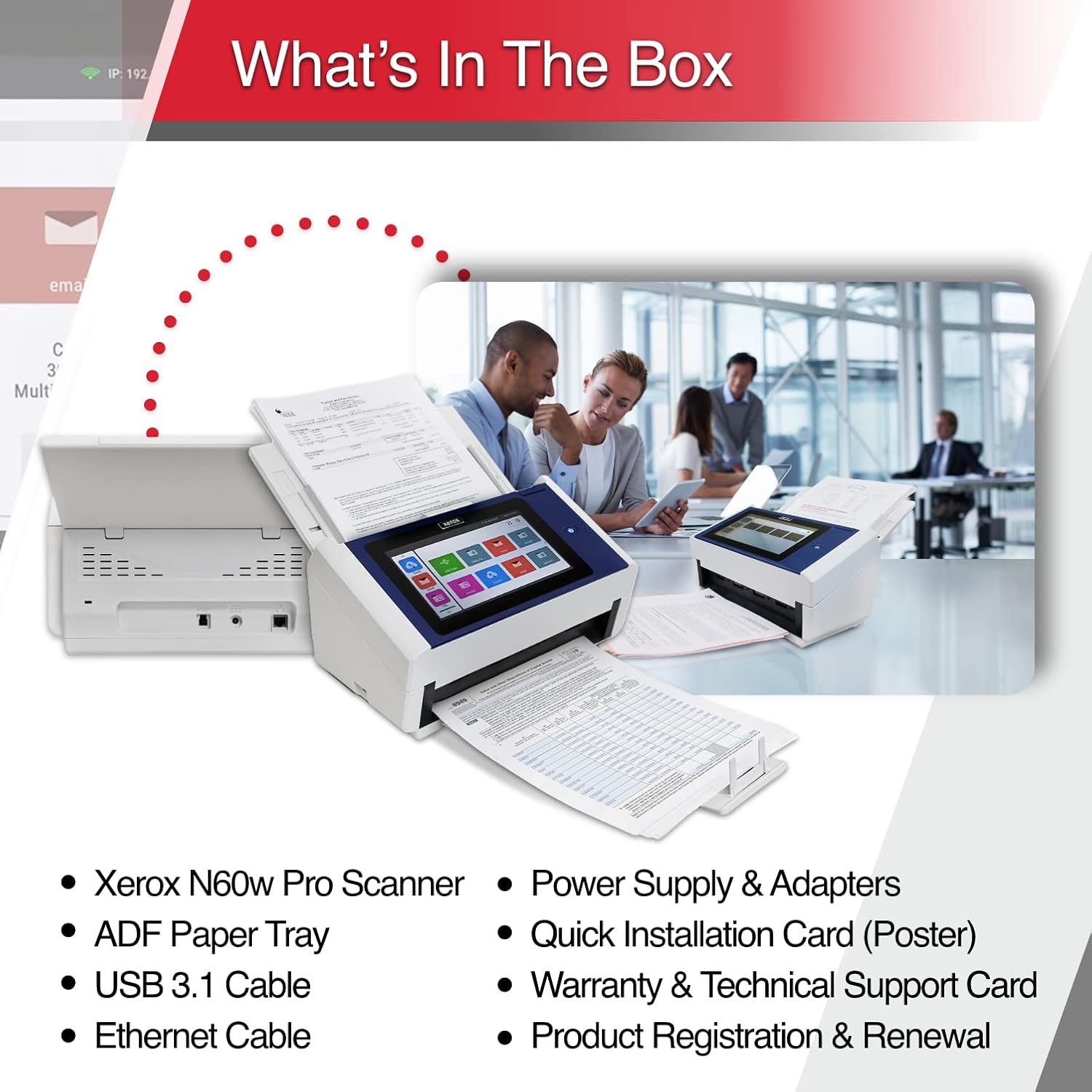 The Xerox N60w Pro scanner for computers features an 8 inch touchscreen display to deliver an app-based, accessible experience, and the quick scanner can scan up to 65 pages per minute in color, black and white, and grayscale. The photo scanner for laptop allows users to connect directly directly to compatible TWAIN Direct applications via a highly secure web interface, eliminating the need to download drivers or scanning applications to a local PC or client, and documents are easy to share securely to email, network, cloud, and USB-to-PC operation. This color desktop scanner quickly converts documents, plastic cards and forms into digital files, then securely saves them to a computer or in the cloud ready to be accessed another day when needed. This home office scanner can scan up to 130 images per minute (ipm) in duplex at 300 dpi and includes a 100 page Automatic Document Feeder (ADF) that handles everything from business cards to A4/Letter size documents. This double sided scanner features a small footprint at 12.5 x 8.2 x 7.1 inches (W×D×H). The portable scanner helps you to get organized fast by converting paper documents into searchable PDF files to be shared, organized and protected. This color scanner allows users to scan to the “destination” of their choice by pressing a single button, eliminating the multiple steps usually required to save scanned documents in popular file formats. Simply select one of (9) preset (user configurable) destinations and documents will be scanned with the correct settings for resolution, color, cropping and file format. Final images are delivered to virtually any application, folder or device, all at the touch of a button. Visioneer Acuity technology enables the receipt and document scanner organizer to instantly improve the visual clarity of every scanned image so that you can get perfect scans from imperfect originals.